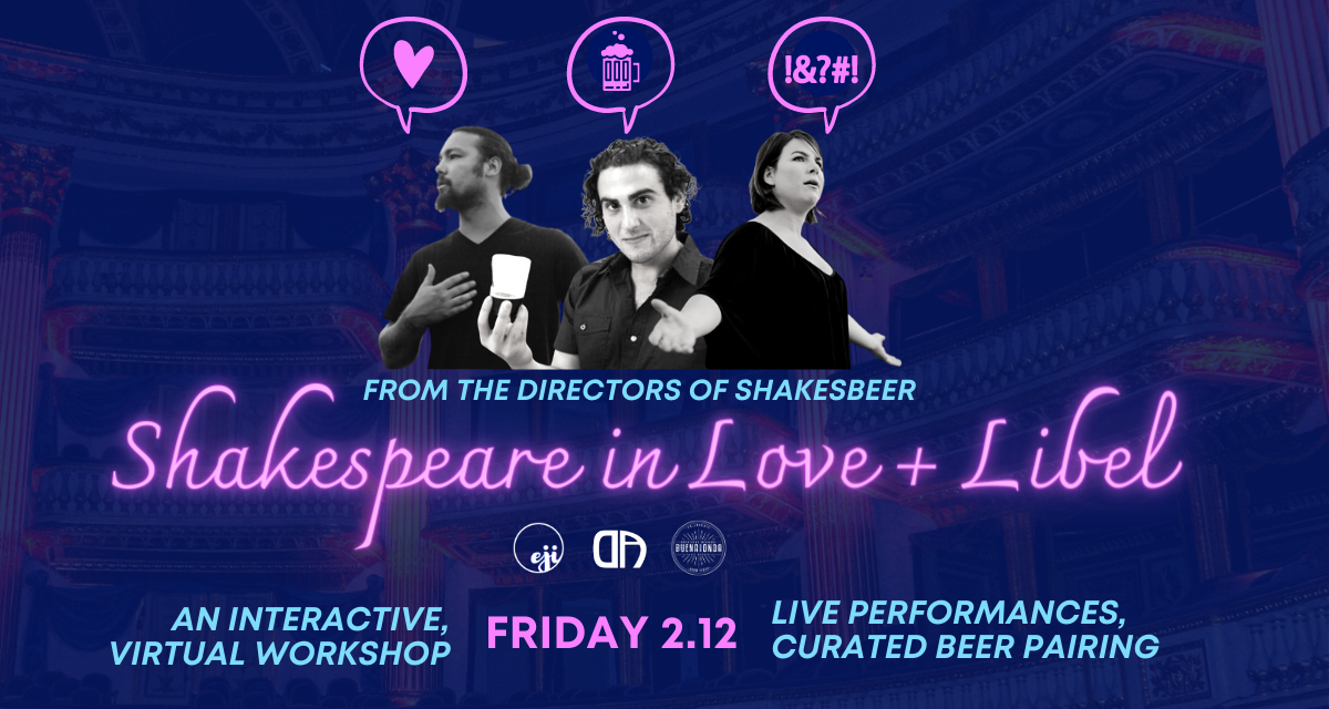 Join us as we bring the directors of SHAKESBEER to the virtual stage for an interactive workshop including live performances, curated beer + empanada pairing, and tutelage in the fine arts of insulting enemies and inspiring love through Shakespeare’s English.
