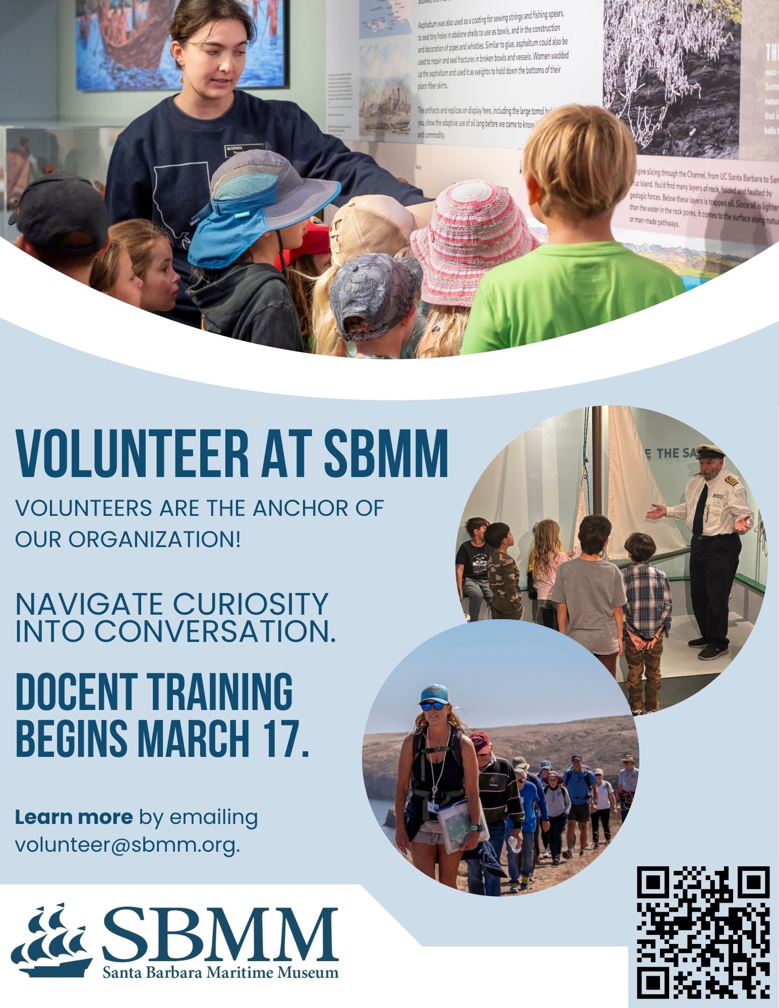 “Volunteers are truly the heart of our museum,” said SBMM Board President Alex Weinstein, M.D. “They play a huge role in creating great experiences for our visitors and in preserving Santa Barbara’s maritime heritage. This program gives volunteers a chance to make a real impact while also getting a behind-the-scenes look at our maritime history.”