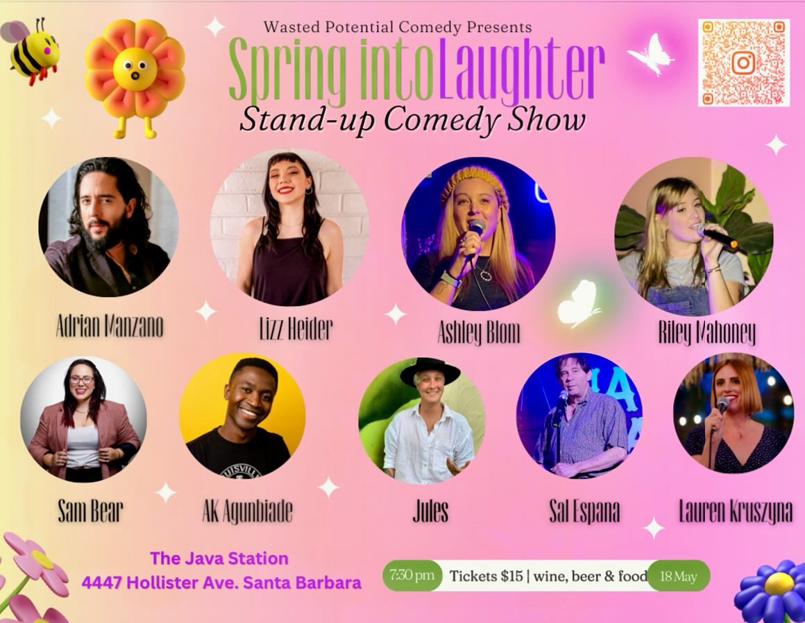 Join us for a night of laughter at Wasted Potential’s ‘Spring Into Comedy’ event! Featuring headliner Lizz Hader, hosted by the hilarious Ashley Blom, and a lineup of talented comics guaranteed to tickle your funny bone. Happening at Java Station on Hollister Rd in Santa Barbara at 7:30pm. Grab your $15 tickets now for an evening of non-stop giggles. Free parking available, with delicious food and drinks on offer throughout the show. Don’t miss out on this springtime celebration of humor!
