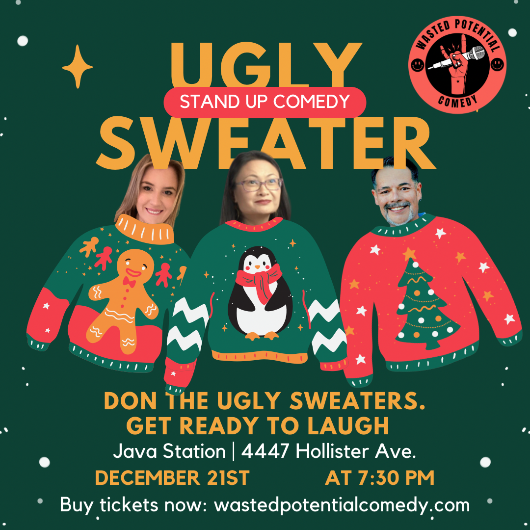 Join Wasted Potential Comedy for a festive night of laughter, drinks, and holiday cheer at our Ugly Sweater Comedy Show! Dig out your most outrageous holiday sweater and celebrate the season with us and some amazing comedy. Whether you’re unwinding from holiday chaos or just soaking up the festive vibes, this is the perfect way to spend your Saturday night.