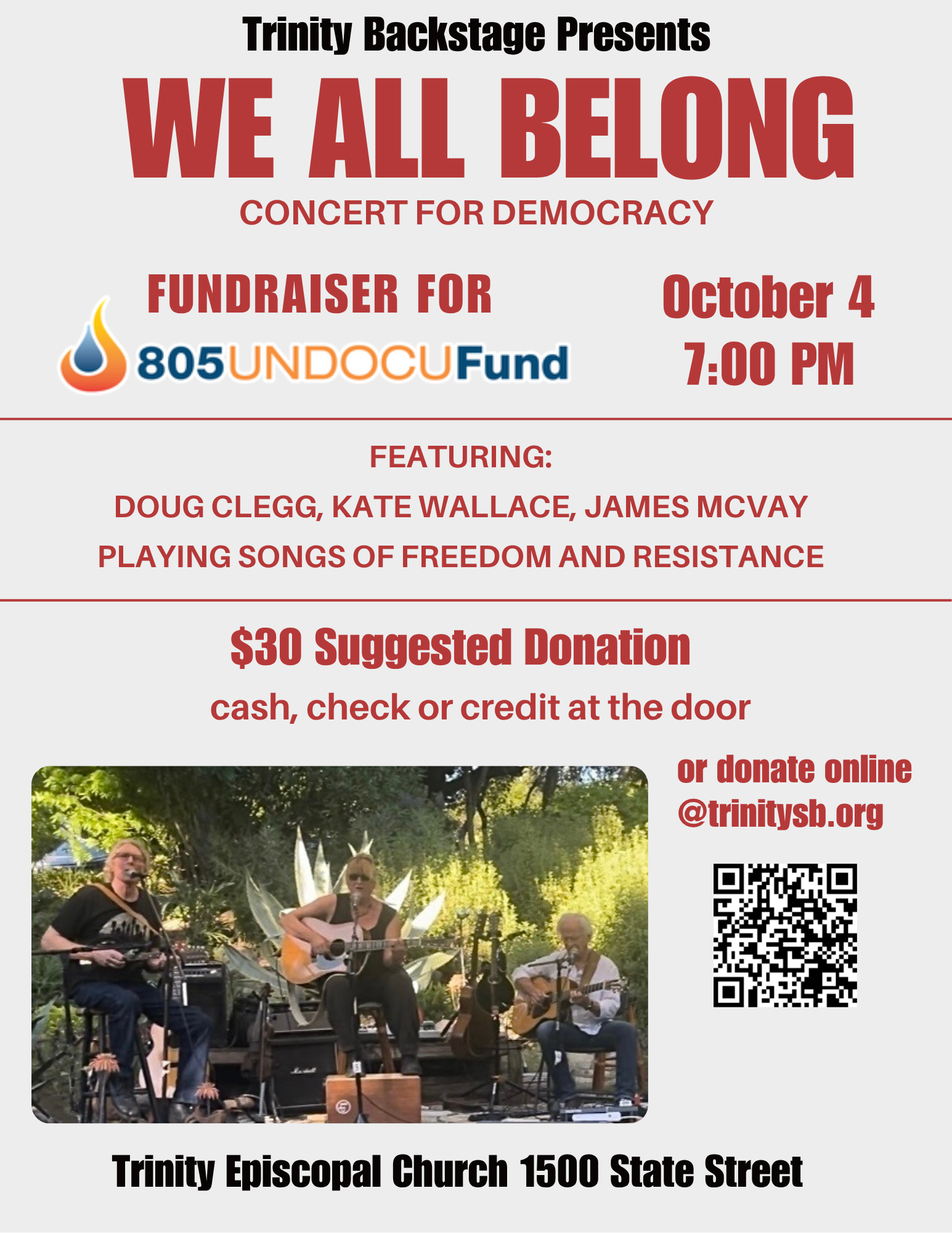 Trinity Backstage Presents: We All Belong, A Concert for Democracy. Raising funds for 805UndocuFund.