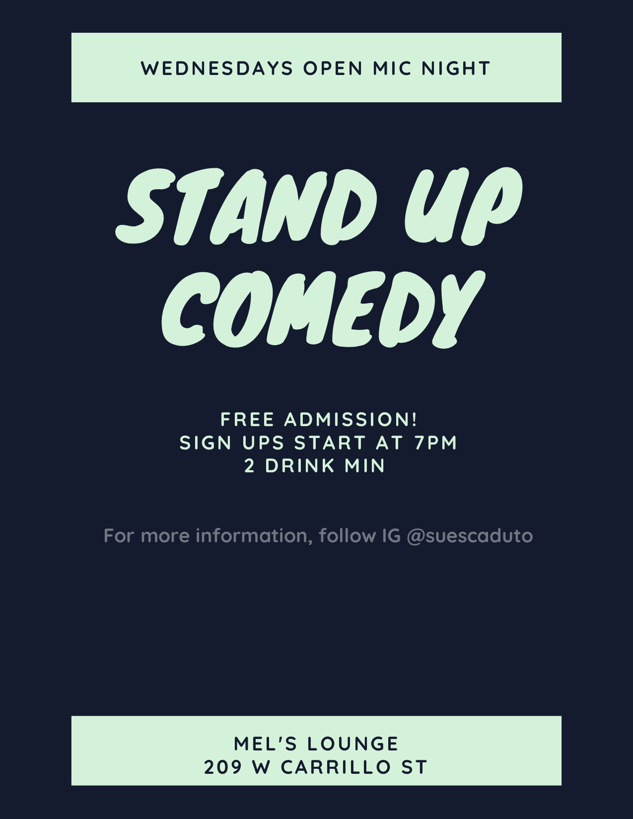 Every Wednesday night, Mel’s Lounge on Carrillo, will be hosting Stand-up comedy Open Mic.