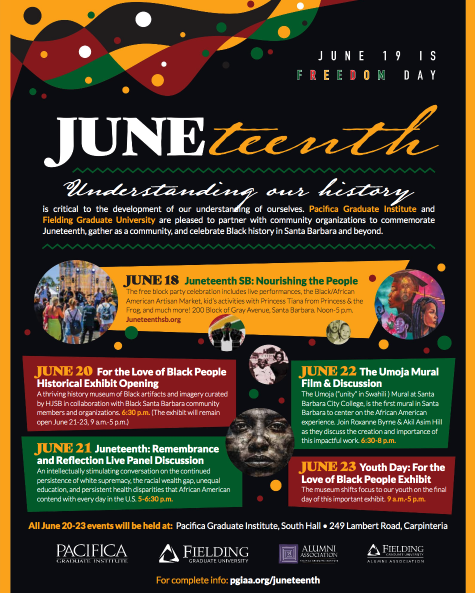 Understanding our history is critical to the development of our understanding of ourselves. Juneteenth, which celebrates the emancipation of enslaved peoples in the United States, is a time for remembrance and reflection. Pacifica Graduate Institute and Fielding Graduate University are pleased to partner with organizations in the community to commemorate Juneteenth, gather as a community, and learn further about the Black history in Santa Barbara and beyond. https://pgiaa.org/juneteenth/