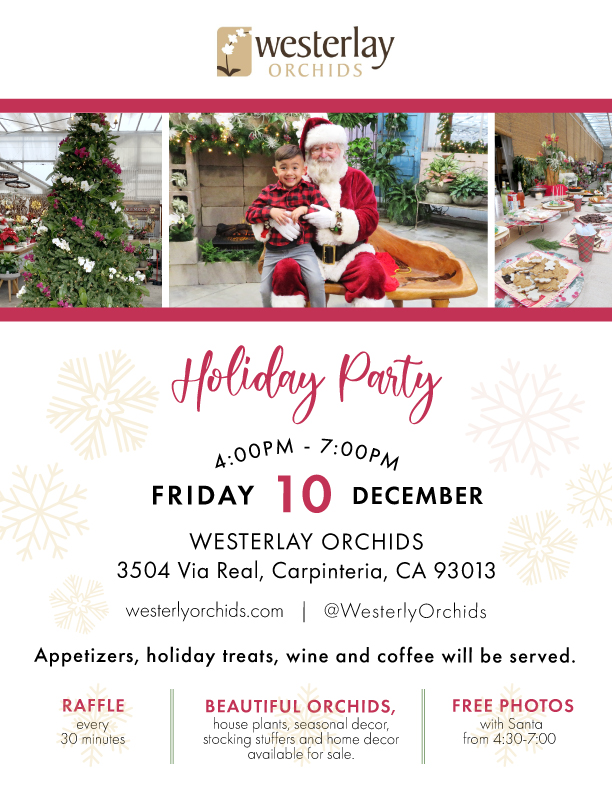 Join us for a little bubbly and good cheer to toast the holidays and the New Year. Westerlay Orchids 3rd Annual Holiday Open House takes place Friday December 13th from 4:00pm – 7:00pm.