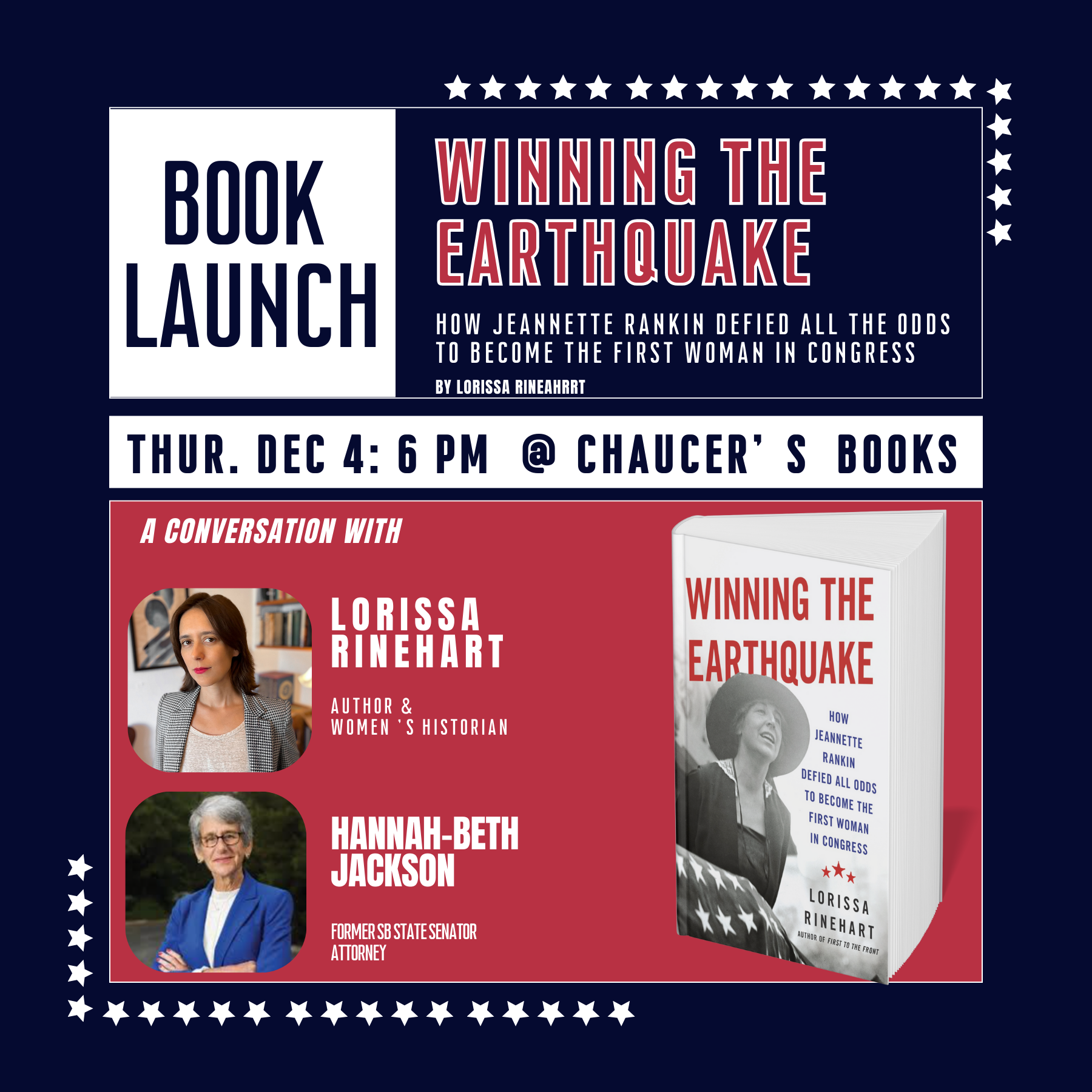 Please join us at Chaucer’s Books on Thursday, December 4, at 6 PM for a conversation with former State Senator Hannah-Beth Jackson and author Lorissa Rinehart about her new book Winning The Earthquake (St. Martin’s Press).