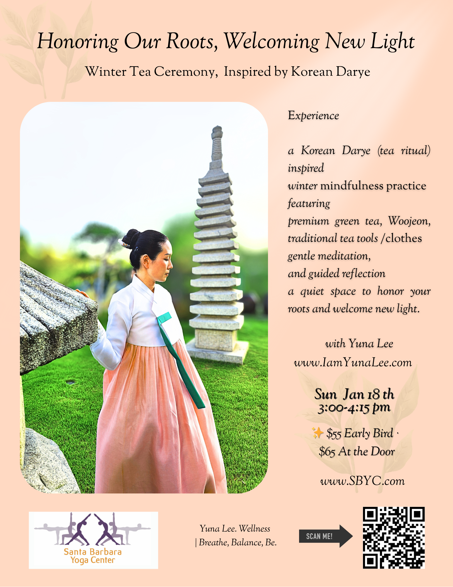 Yuna Lee is a Korean tea practitioner, breathwork guide, and sound healer offering mindfulness-based ceremonies in Santa Barbara and Joshua Tree. Trained in Darye, the Korean tea tradition, under a tea master in the Kimhae province of South Korea, she blends cultural lineage, intentional movement, and contemplative practices to create spaces of calm, clarity, and gentle renewal.