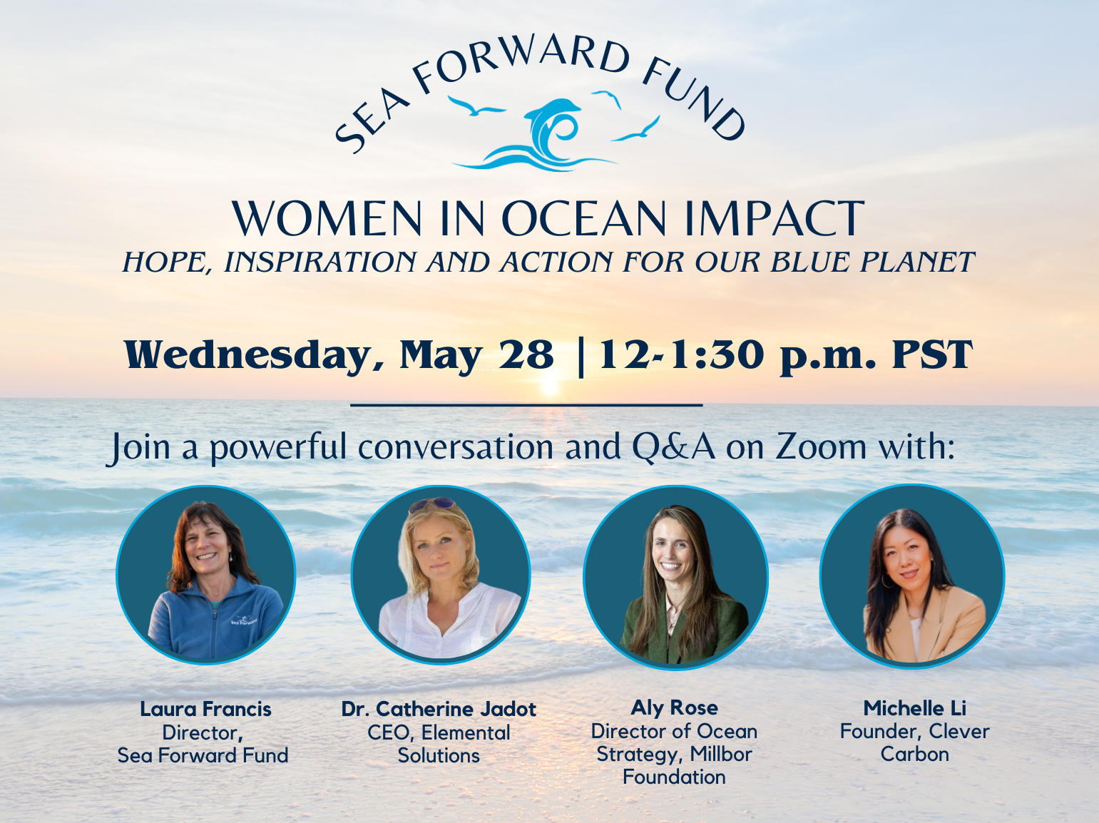 In the face of complex environmental challenges—where roadblocks often feel overwhelming—it’s more important than ever to come together in pursuit of solutions. Join Sea Forward on Wednesday, May 28, from 12–1:30 p.m. PST for a dynamic conversation with leading ocean innovators. Author and CEO of Elemental Solutions Dr. Catherine Jadot, Millborn Foundation Director of Ocean Strategy Aly Rose, and Clever Carbon Founder and renowned thought leader Michelle Li will join Sea Forward Fund Director and Santa Barbara local Laura Francis to inspire hope and share bold strategies for marine conservation, sustainability, and impact investing.