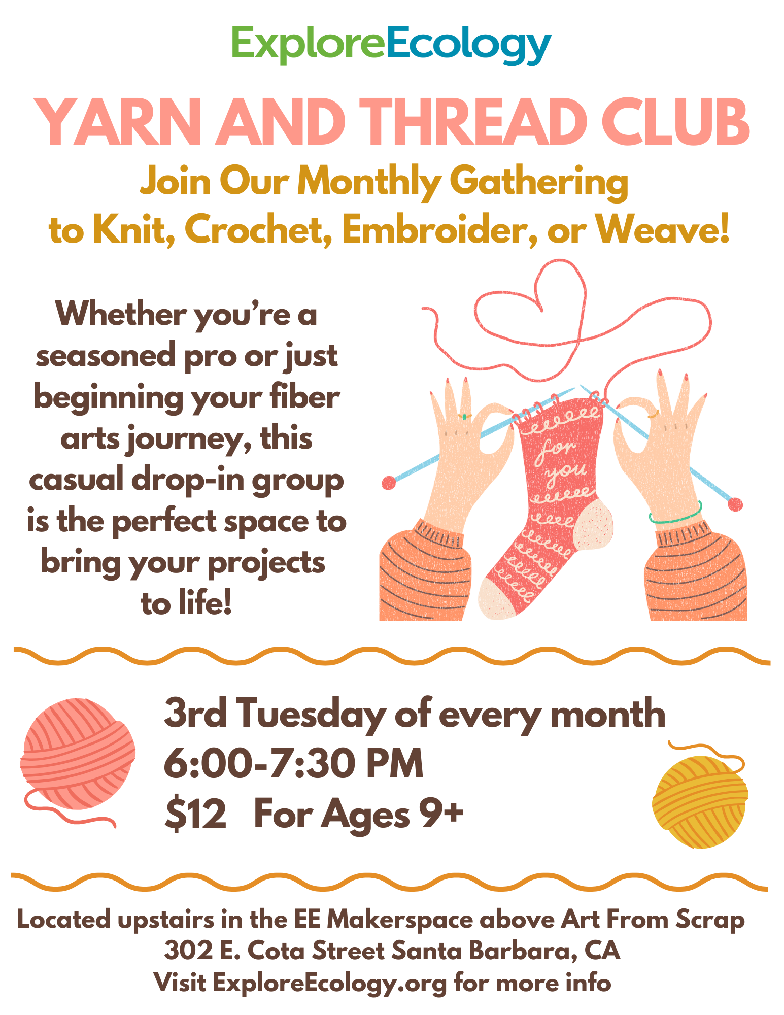 Yarn & Thread Club is a casual, drop-in crochet, knitting, weaving, and embroidery circle held at the Explore Ecology Makerspace! Whether you’re a seasoned pro or just beginning your fiber arts journey, our monthly club is the perfect space to bring your projects to life.