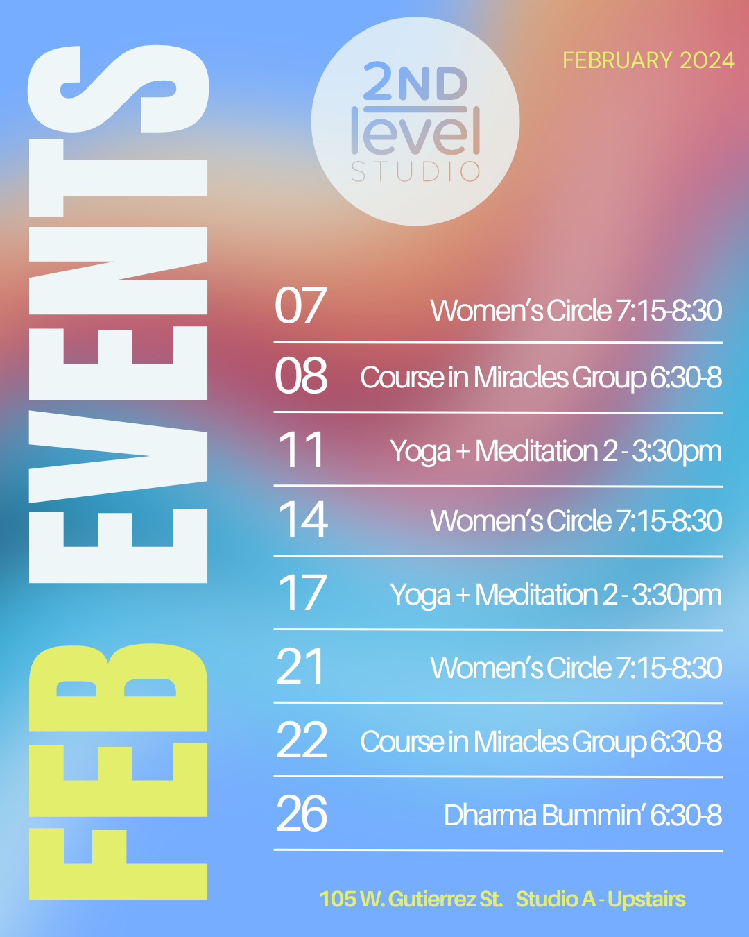 Join us at Second Level Studio for a variety of offerings! As part of our Mind, Body, Spirit Series, we are hosting yoga & meditation, weekly women’s circles, weekly spirituality talks and more! Keep an eye on our online events calendar for other offerings. Visit our website to subscribe to our newsletter or to inquire about renting our space.