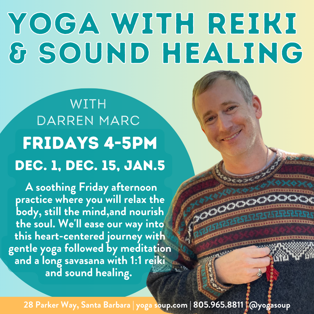 Join Darren Marc Levene for a soothing Friday afternoon practice where you will relax the body, still the mind,and nourish the soul. We’ll ease our way into this heart-centered journey with gentle yoga followed by meditation and a long savasana with 1:1 reiki and sound healing. You will leave this class feeling centered, relaxed, and inspired to shine your light in the world. It’s the perfect way to ease into the holiday season with lots of love and self-care. Darren draws from over 15 years experience as a yoga teacher, meditation teacher, sound healer, and meditation teacher to curate this unique offering of the heart.