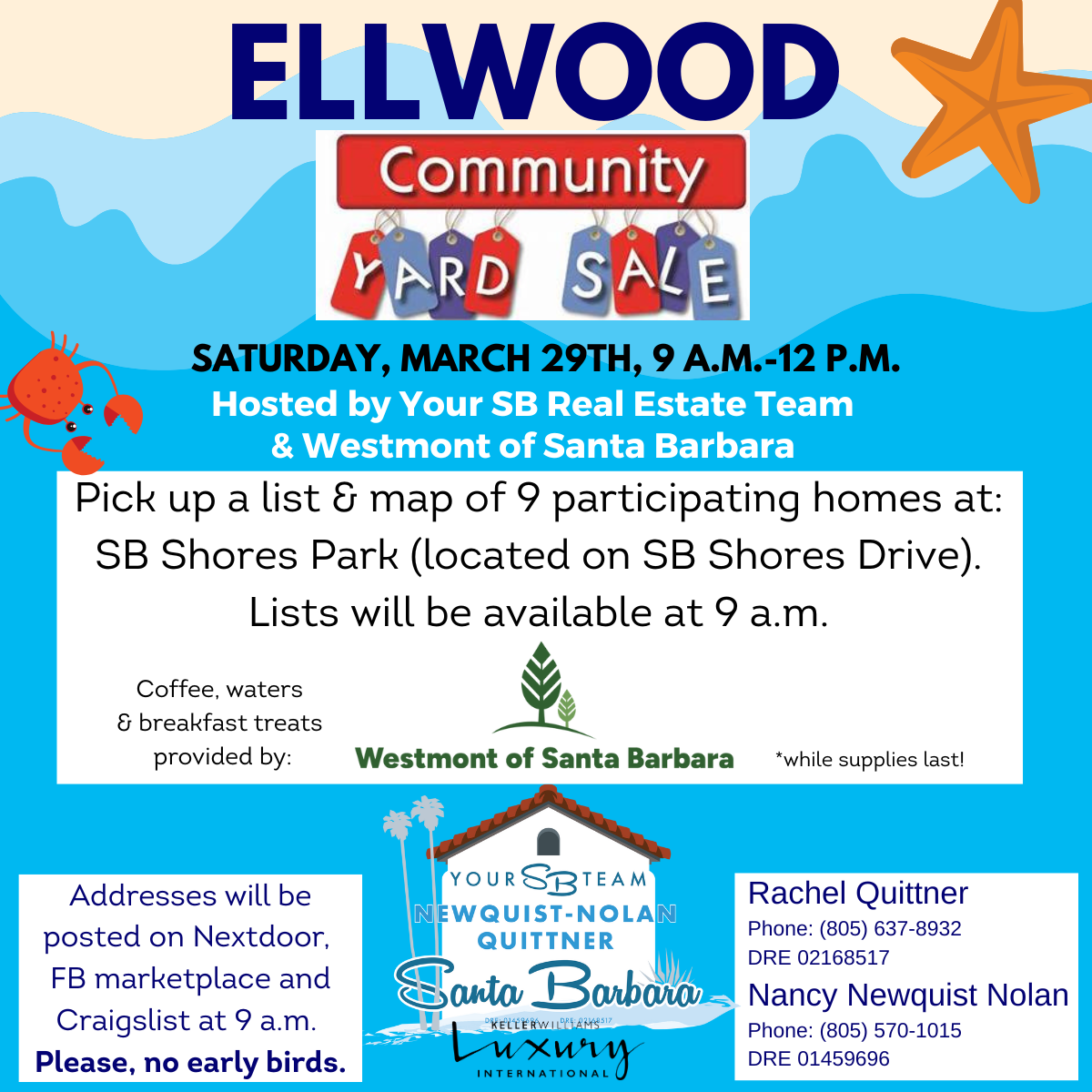 Nancy Newquist Nolan and Rachel Quittner of Your SB Real Estate Team joined by Westmont Senior Living are hosting a Community Yard Sale with 9 participating homes in the neighborhood!