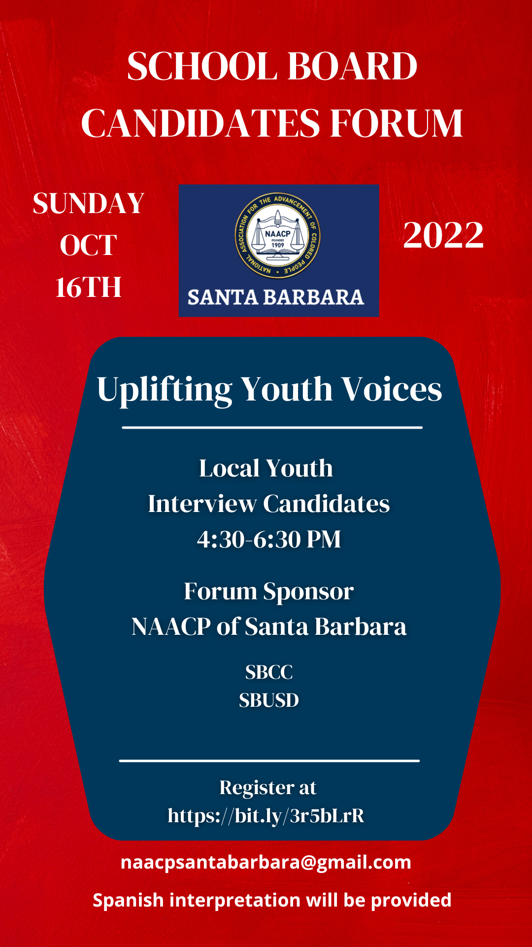 Organized by the Education Committee of NAACP Santa Barbara chapter, the purpose of the forum is to give a wide representation of youth leaders in our community the opportunity to pose questions to the candidates who, if elected, will directly affect their educational experience as students in the District. The youth have a unique perspective and insight into which issues should be priorities for school boards.