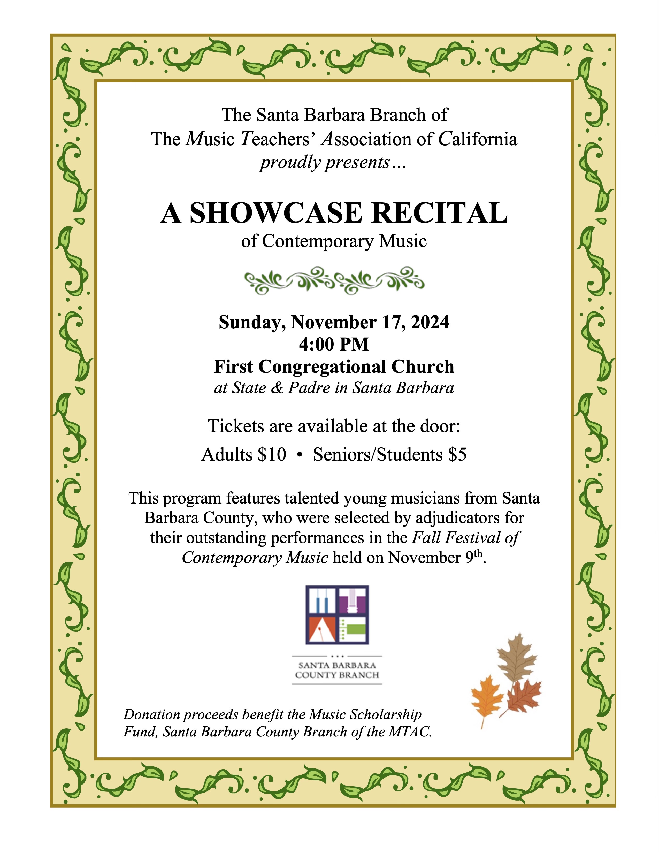 This public concert features talented young musicians from Santa Barbara County who were selected by administrators for their outstanding performances in the Fall Festival of Contemporary Music held on November 9th. Pianists, vocalists, violinists and flutists will be featured.