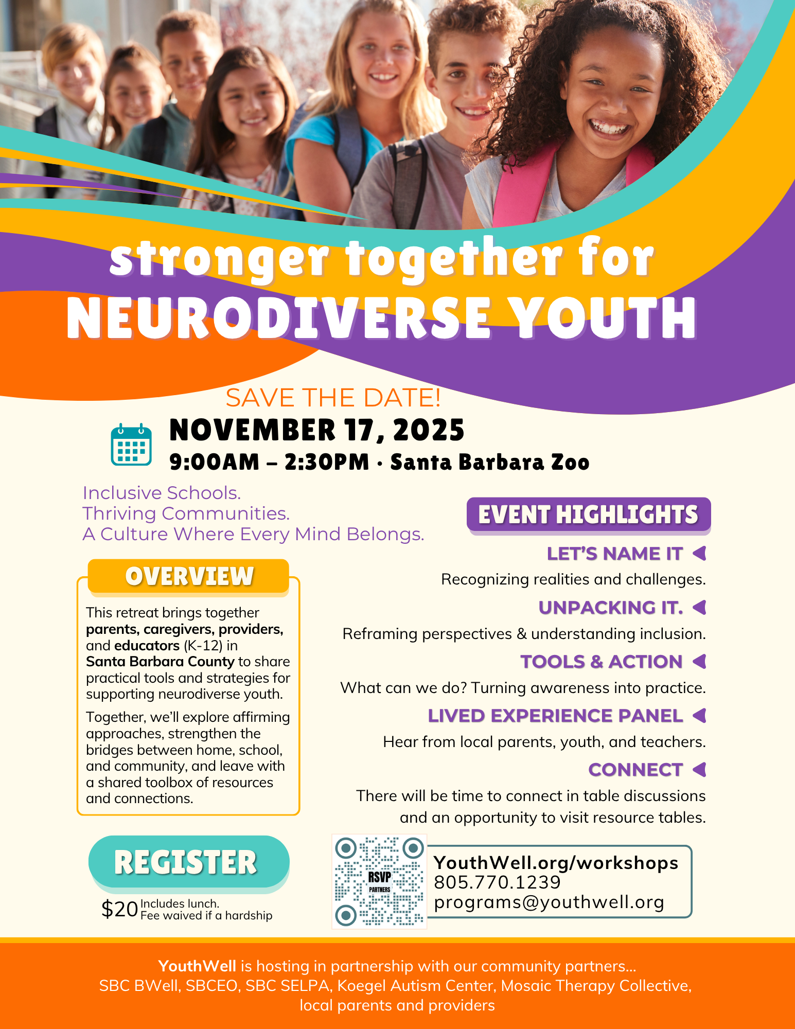 Stronger Together for Neurodiverse Youth is a one-day, in-person retreat designed for everyone involved in the care, education, and growth of neurodiverse youth in Santa Barbara County.