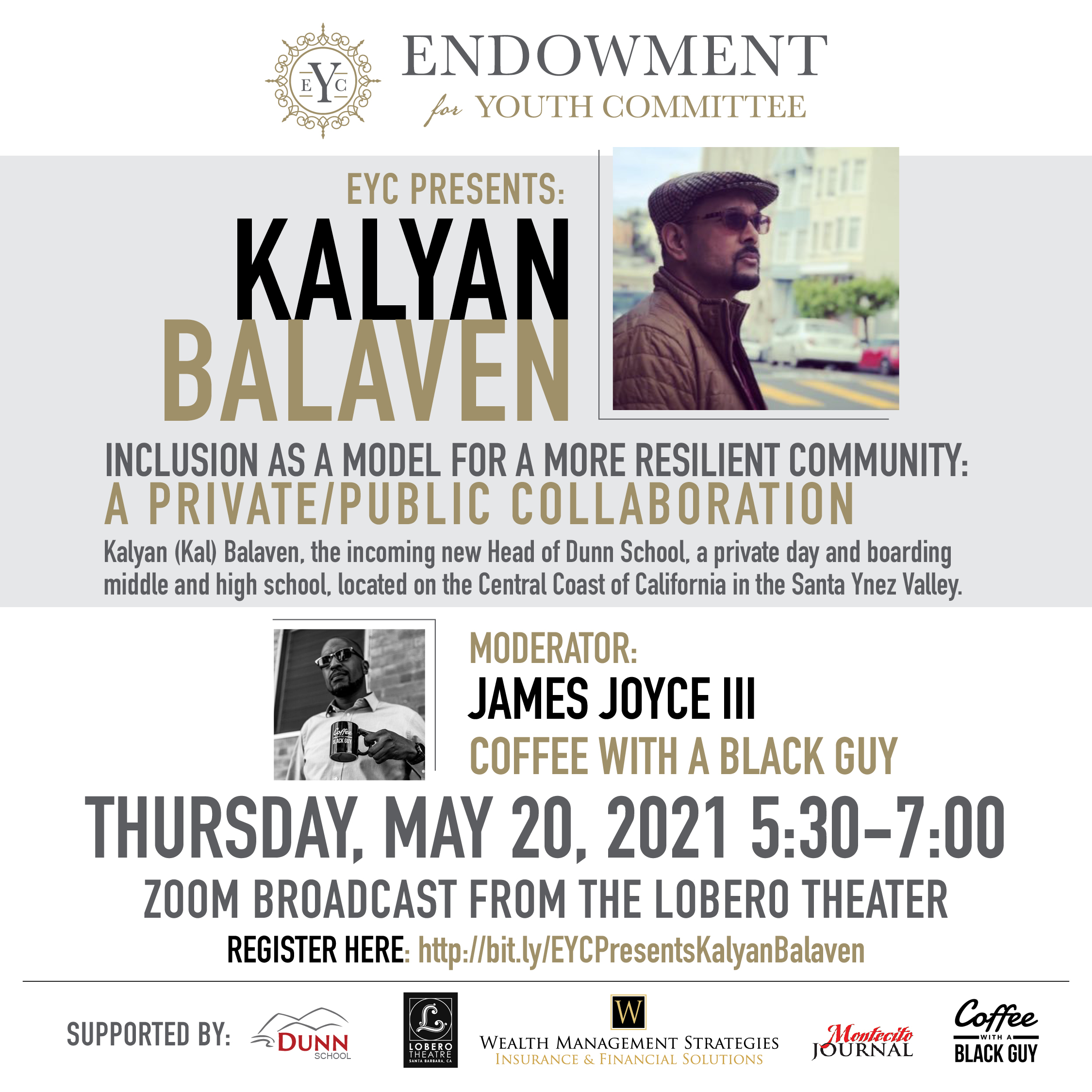 This virtual community event will take place on Thursday, May 20, 2021, from 5:30-7:00. Please see the attached flyer for more details including the link to register for this event: http://bit.ly/EYCPresentsKalyanBalaven. We look forward to you joining us. Special Thanks to our partners in this event, Dunn School, Montecito Journal, Coffee With A Black Guy, Lobero Foundation and Wealth Management Strategies.