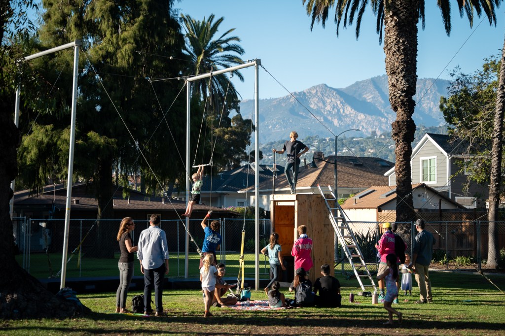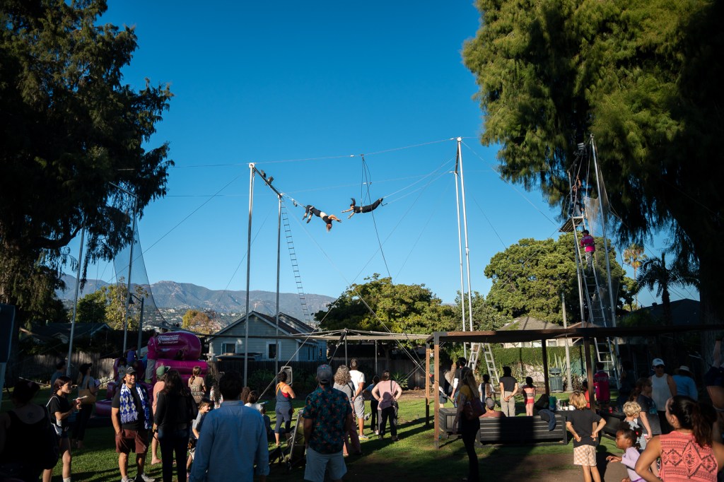The American Cancer Society (ACS) and Santa Barbara Trapeze Company (SBTC) partnered to celebrate Breast Cancer Awareness Month on Saturday, hosting a lively community event at Plaza de Vera Cruz featuring free tacos and parkour and flying trapeze sessions.