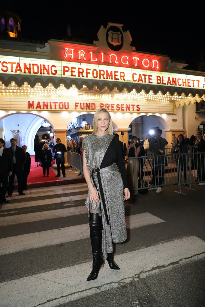 Indeed, her asymmetric, shimmering silver and black haute couture gown with high stiletto boots was as eye catching as it was unusual. As fetching as the bold look was, the über-talented Blanchett always commands our attention, no matter what part she’s playing.