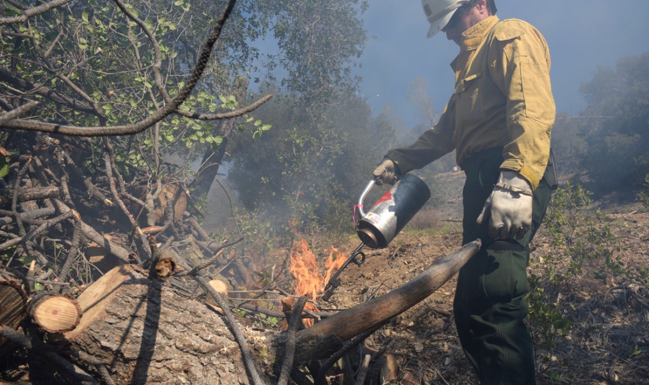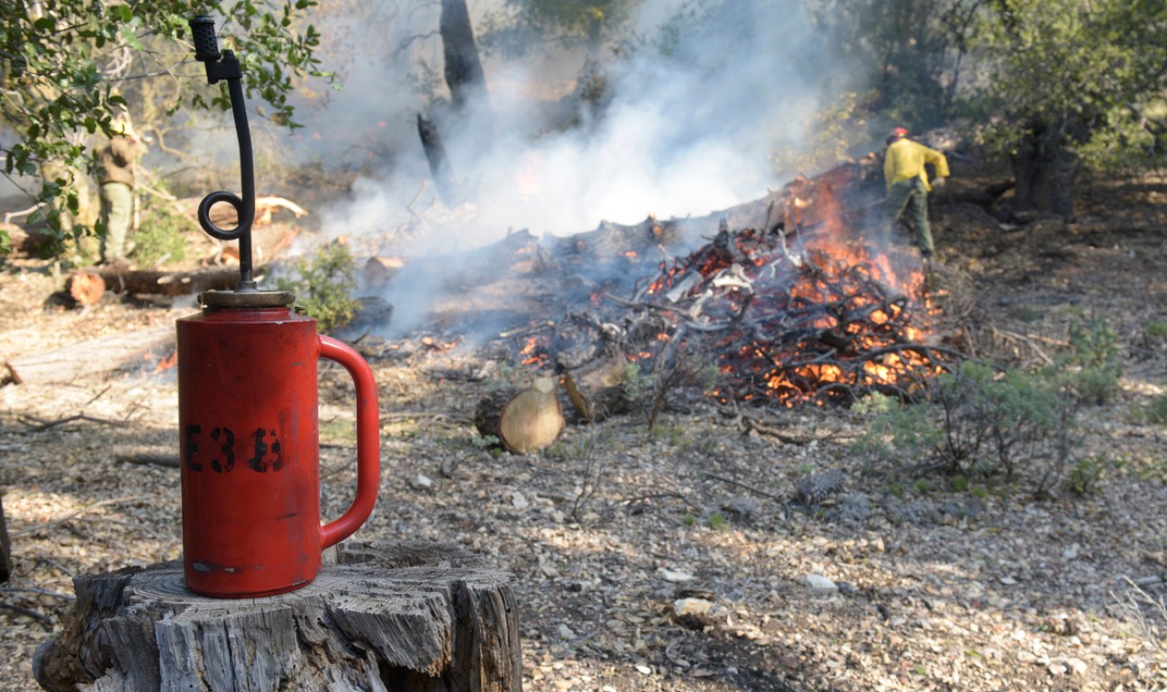 Los Padres National Forest Service firefighters prioritize cutting branches off fallen trees, those eight inches in diameter and smaller, forming piles 10 feet wide. They use a gas mixture and drip torches to ignite each mound.
