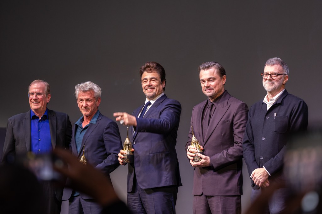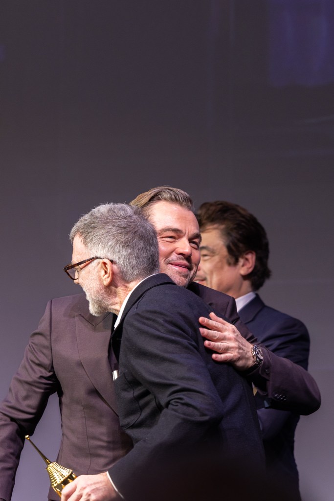 Paul Thomas Anderson, Leonardo DiCaprio, Sean Penn, and Benicio del Toro at the SBIFF Hammond Cinema Vanguard Awards, Arlington Theatre, February 9, 2926 | Photo: Ingrid Bostrom