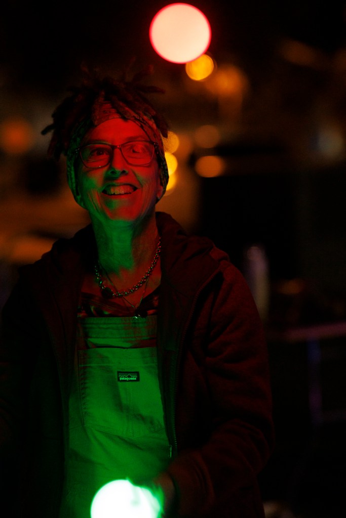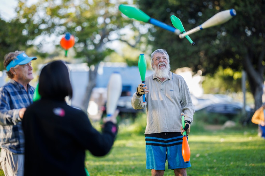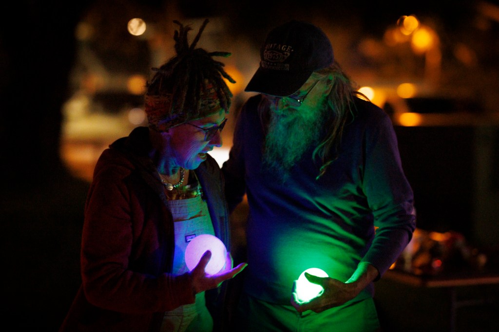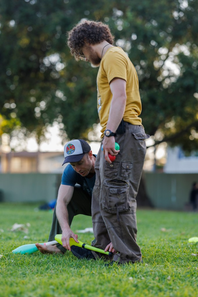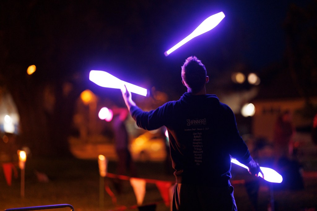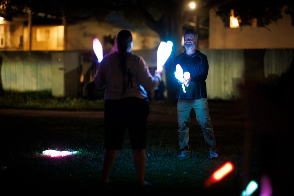 The event drew jugglers from Los Angeles and the Central Coast, many of whom know each other from the juggling festival circuit. But the crowd of around 60 on Friday was also dotted with folks learning to juggle for the first time, passersby of Little Acorn Park who were drawn in by the colorful clubs and glowing balls.