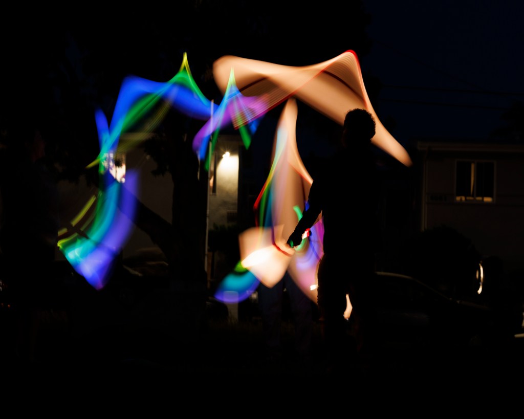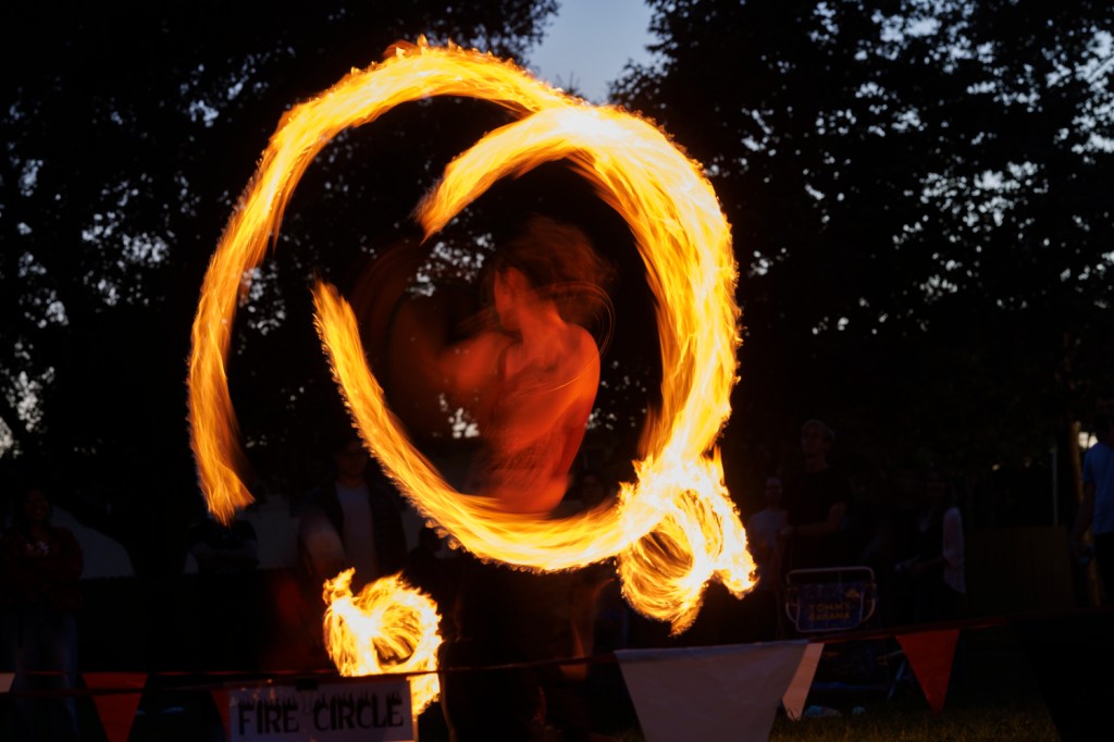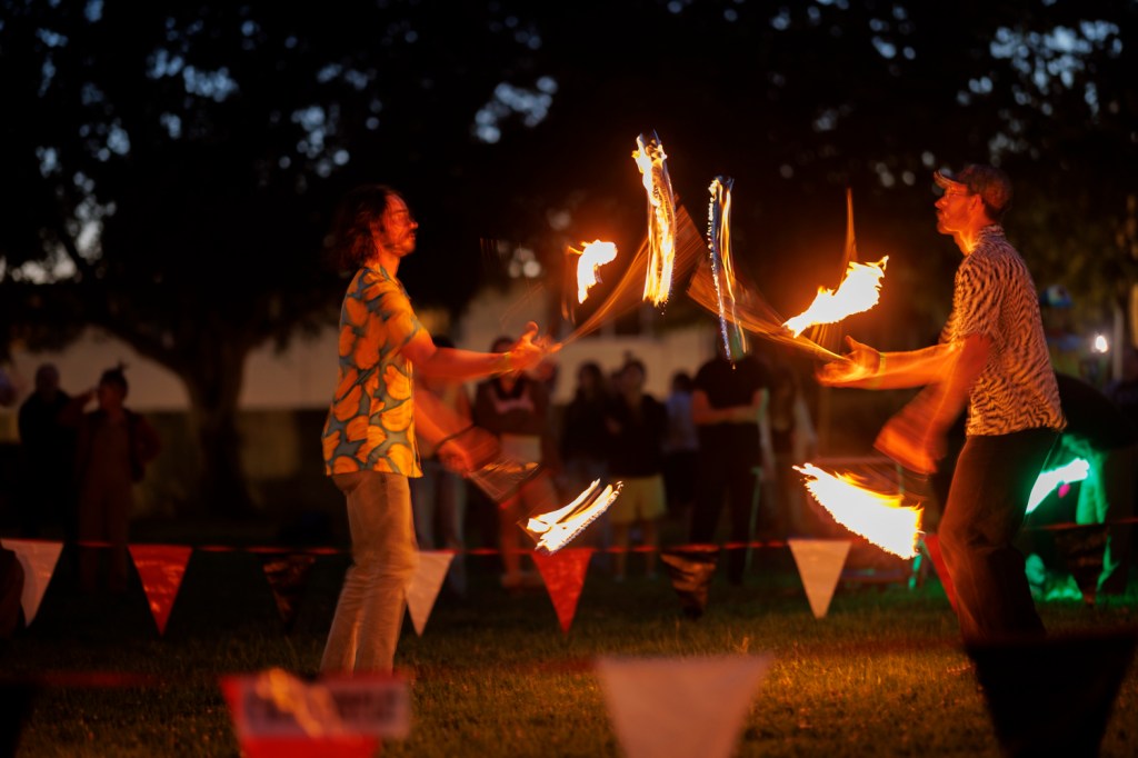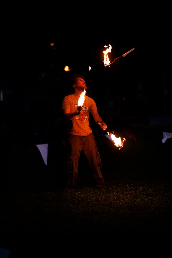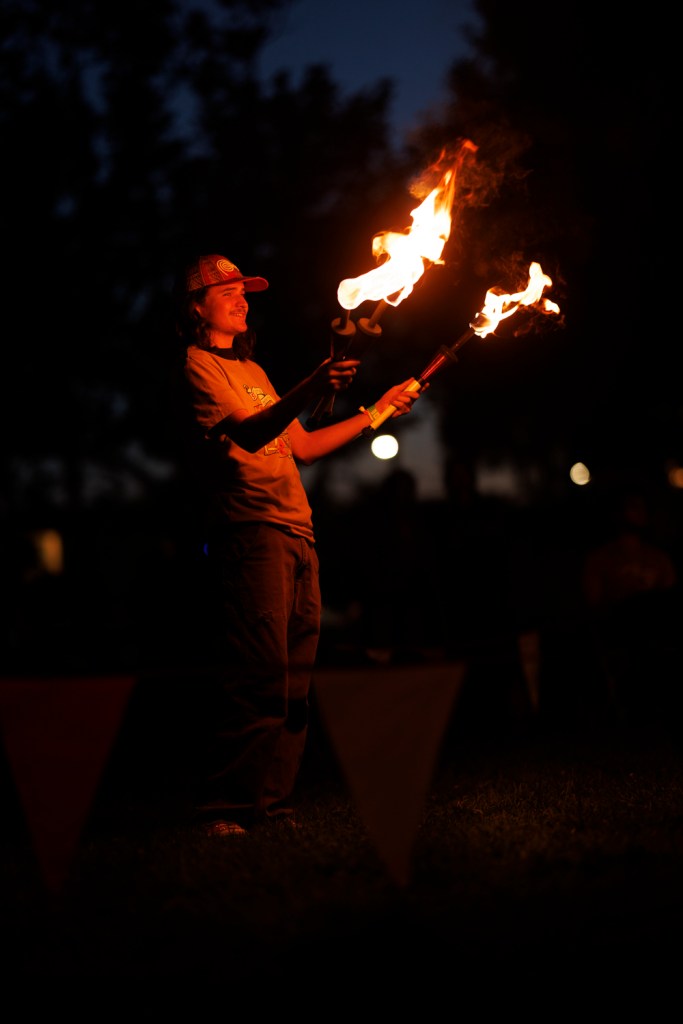 Once the sun had left the sky, the torches were lit. After having a safety briefing where folks learned how to smother flames with fire blankets and signing liability waivers, folks had the opportunity to juggle with fire. For a few, it was their first time catching fire, and many a torch was dropped. Thankfully, the emergency responders who were standing by did not have to extinguish any flames or treat any burns that night.