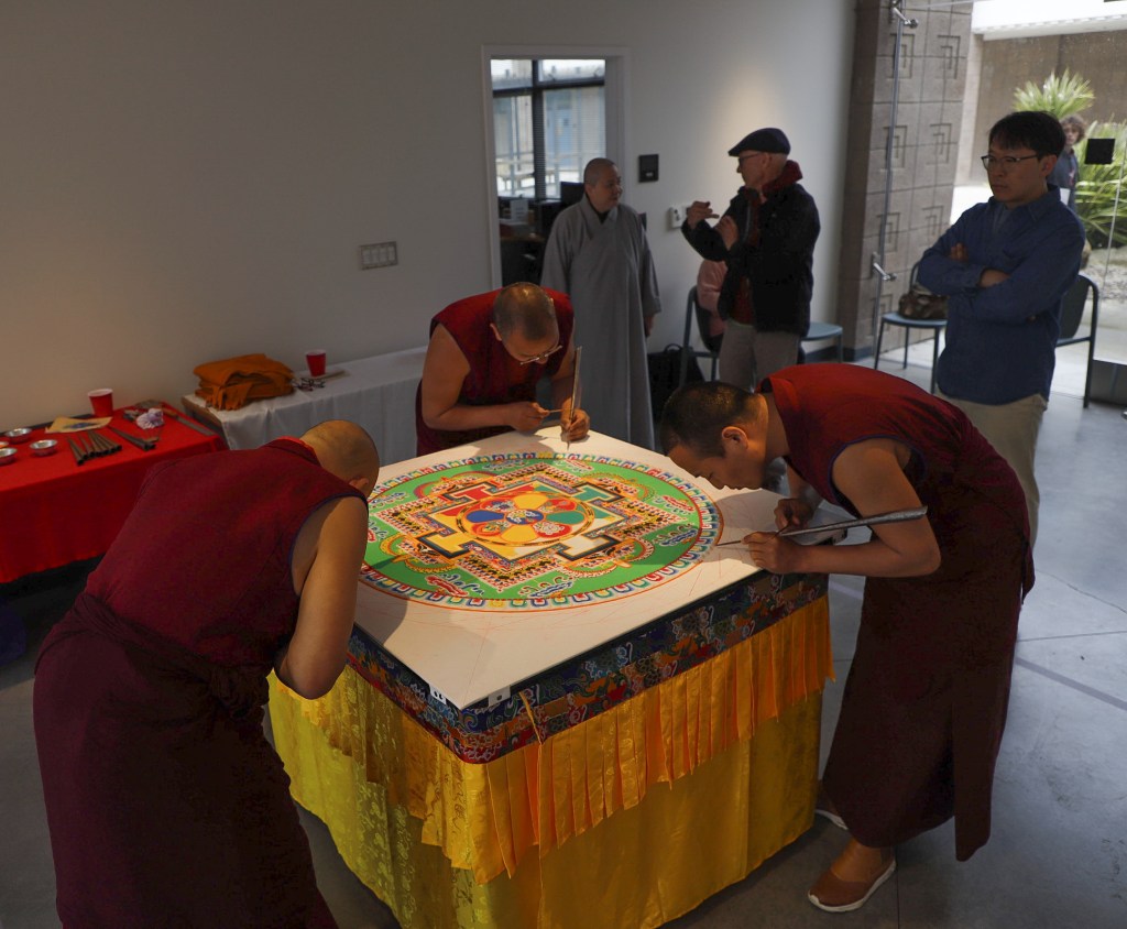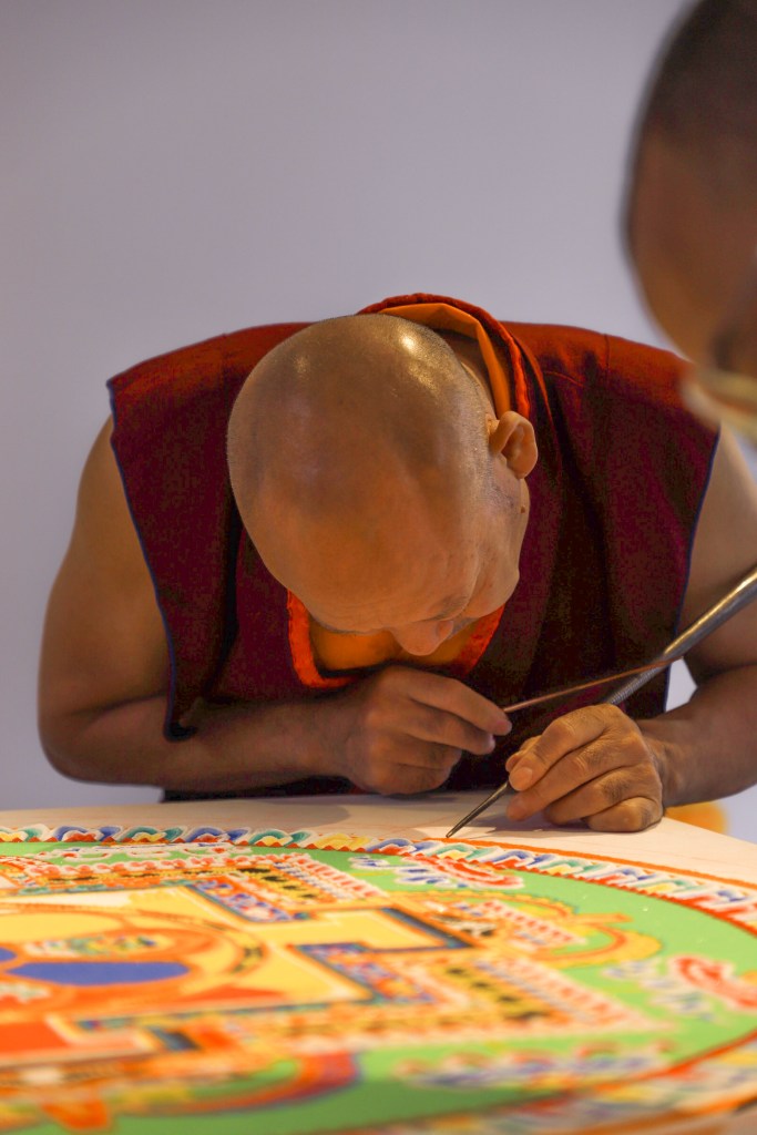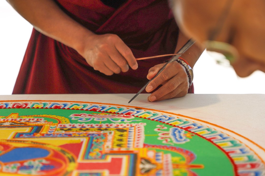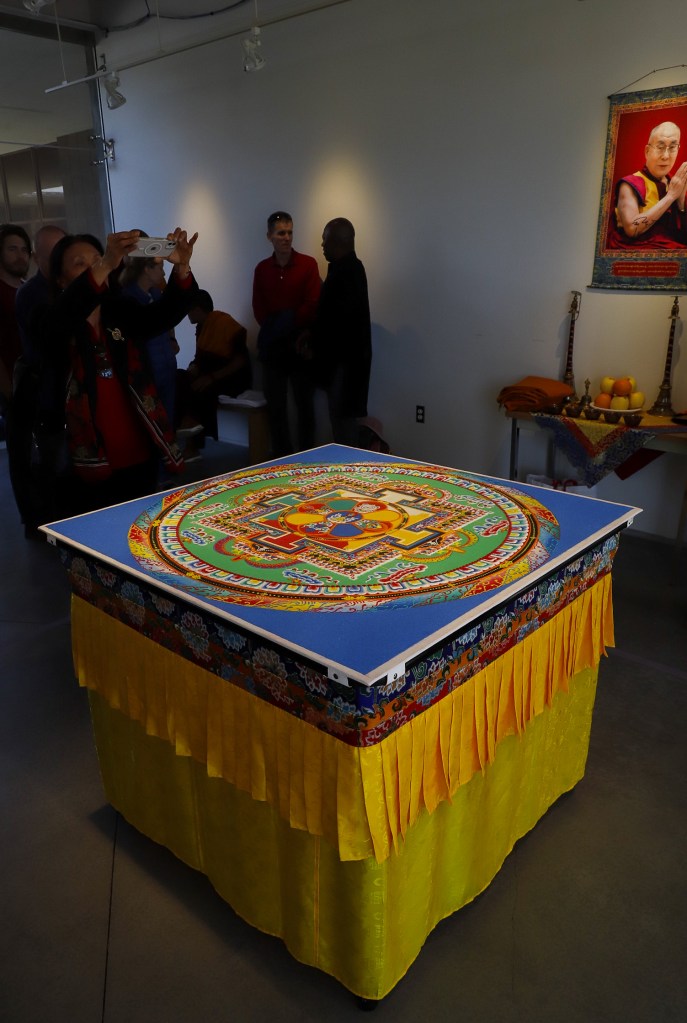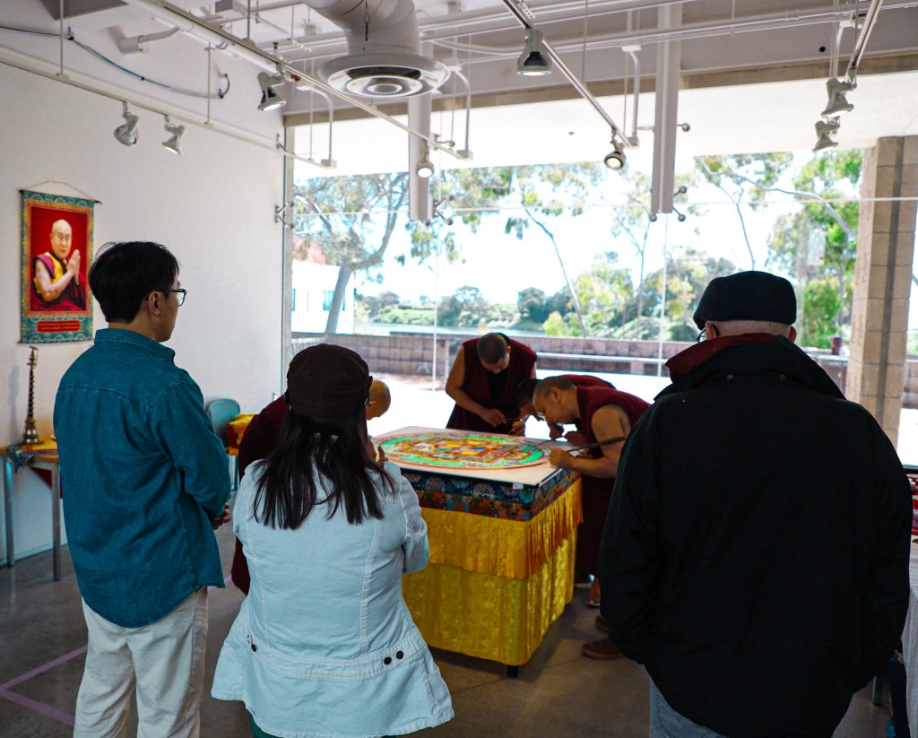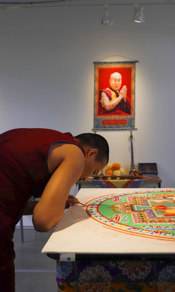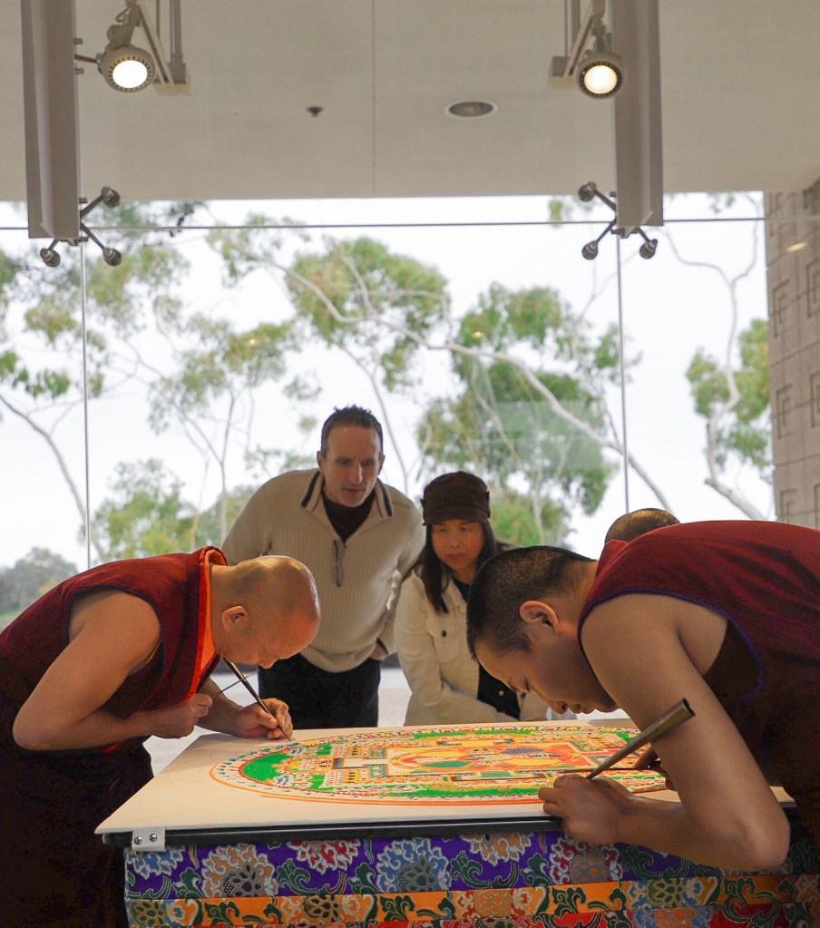 While Deltatopia shenanigans were happening off campus over the weekend, the Art, Design & Architecture Museum at UCSB had a very different vibe going. Six monks from the Drepung Monastery in India constructed a sand mandala to help demonstrate some of the Buddhist teachings about the impermanence of things. Mandalas — the colorful geometric images used for spiritual guidance and as a supporting space for meditation — have a special significance when created in sand, as things of momentary beauty to be enjoyed in the fleeting time before they are blown away and lost.