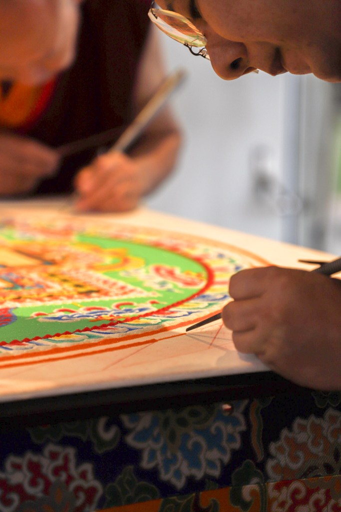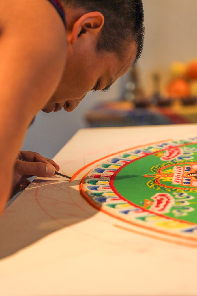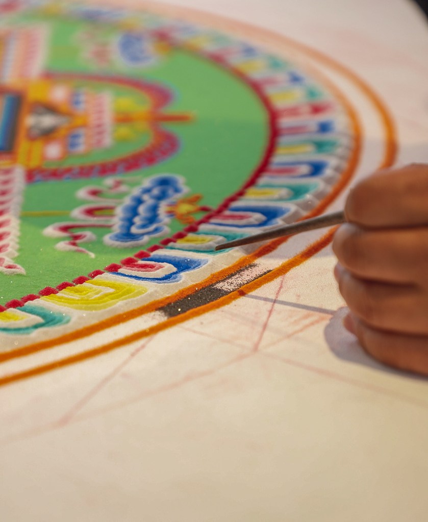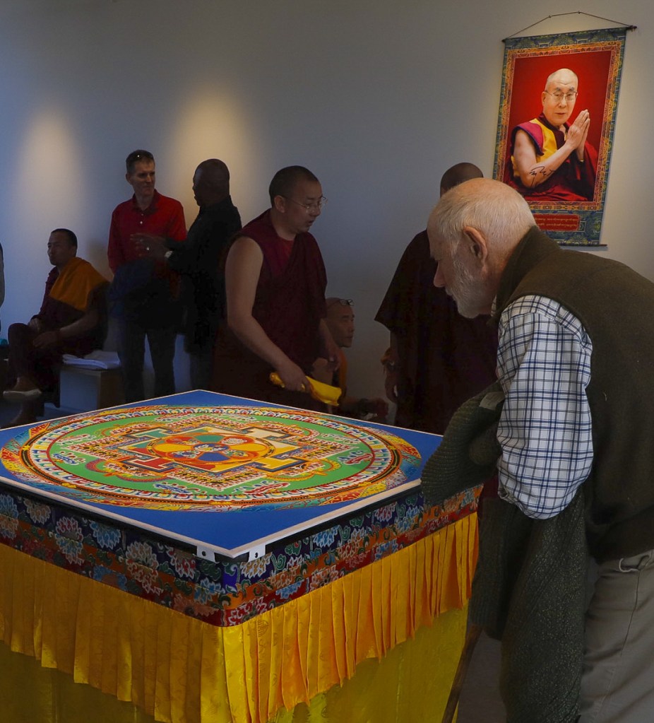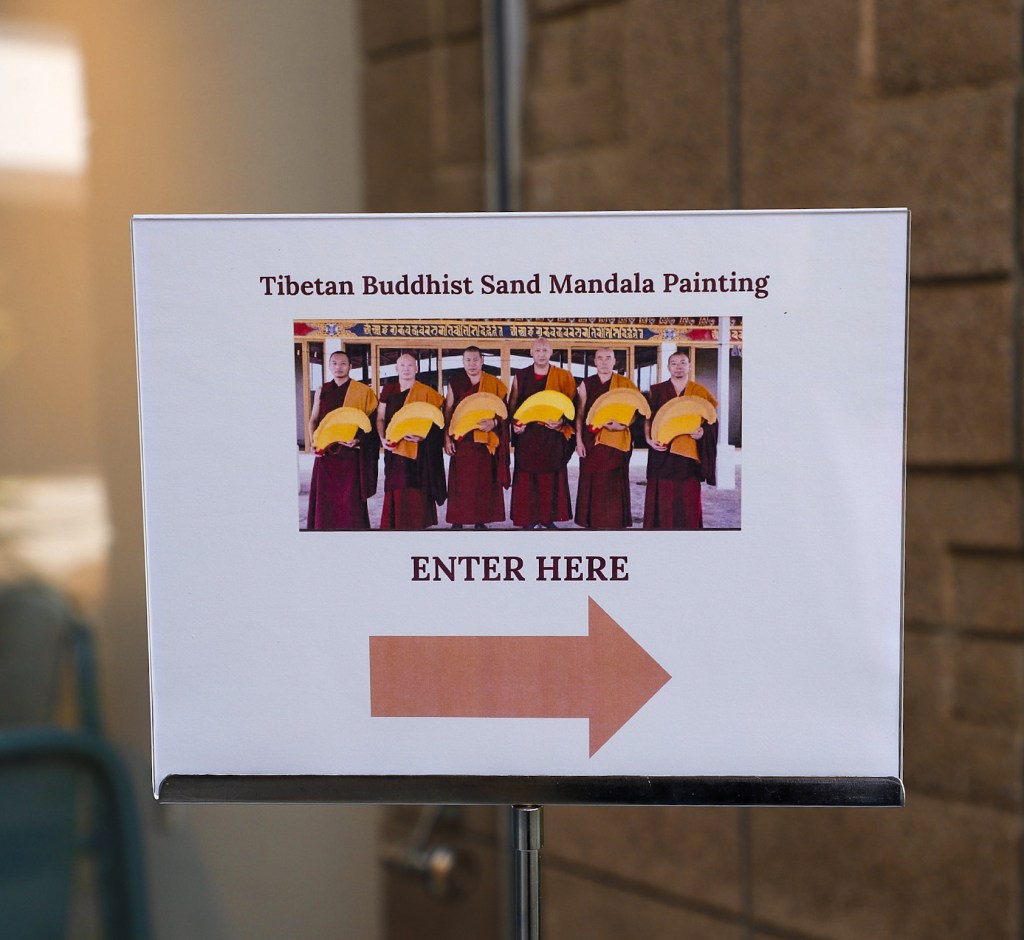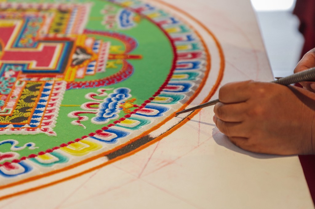 While Deltatopia shenanigans were happening off campus over the weekend, the Art, Design & Architecture Museum at UCSB had a very different vibe going. Six monks from the Drepung Monastery in India constructed a sand mandala to help demonstrate some of the Buddhist teachings about the impermanence of things. Mandalas — the colorful geometric images used for spiritual guidance and as a supporting space for meditation — have a special significance when created in sand, as things of momentary beauty to be enjoyed in the fleeting time before they are blown away and lost.