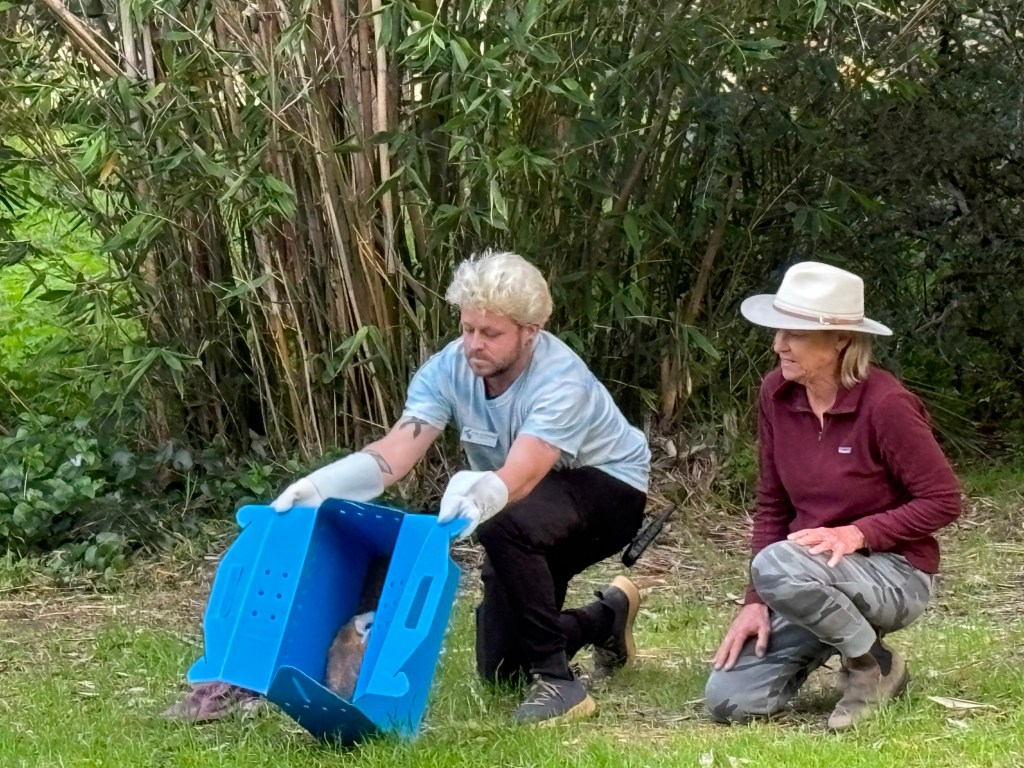 Calm and quiet were important for the wild bird, Alyssa Torkelson indicated, who had brought the owl from the Ojai Raptor Center, where she had been receiving treatment for capture myopathy, a sometimes fatal condition that develops in overly stressed animals. The owl had been rescued from the top of a 50-foot palm tree four weeks before, where she had become tangled in string or fishing line for several hours. Her prognosis was guarded, veterinarian Kathryn Rasp had said, though the owl’s feistiness was a good sign. By last Thursday, the bird’s blood work showed she had recovered, and the release was planned for the same spot she’d been rescued from.