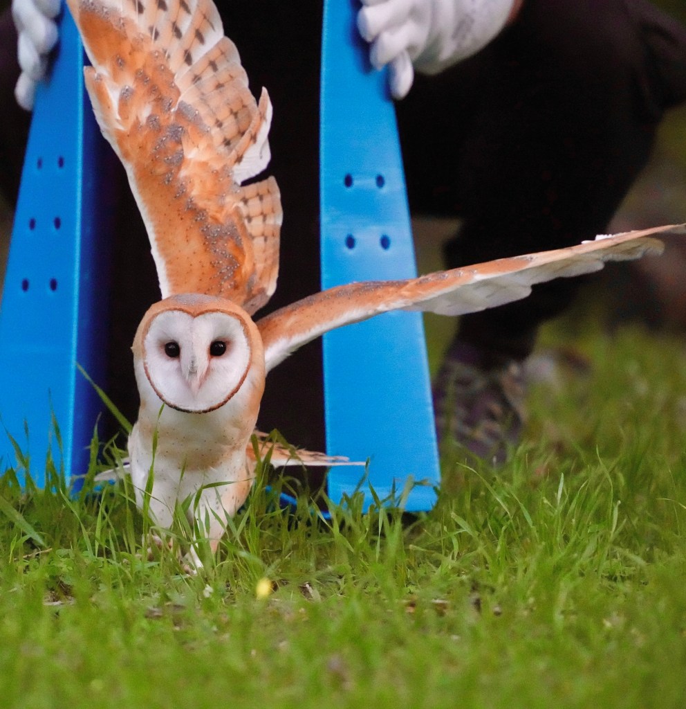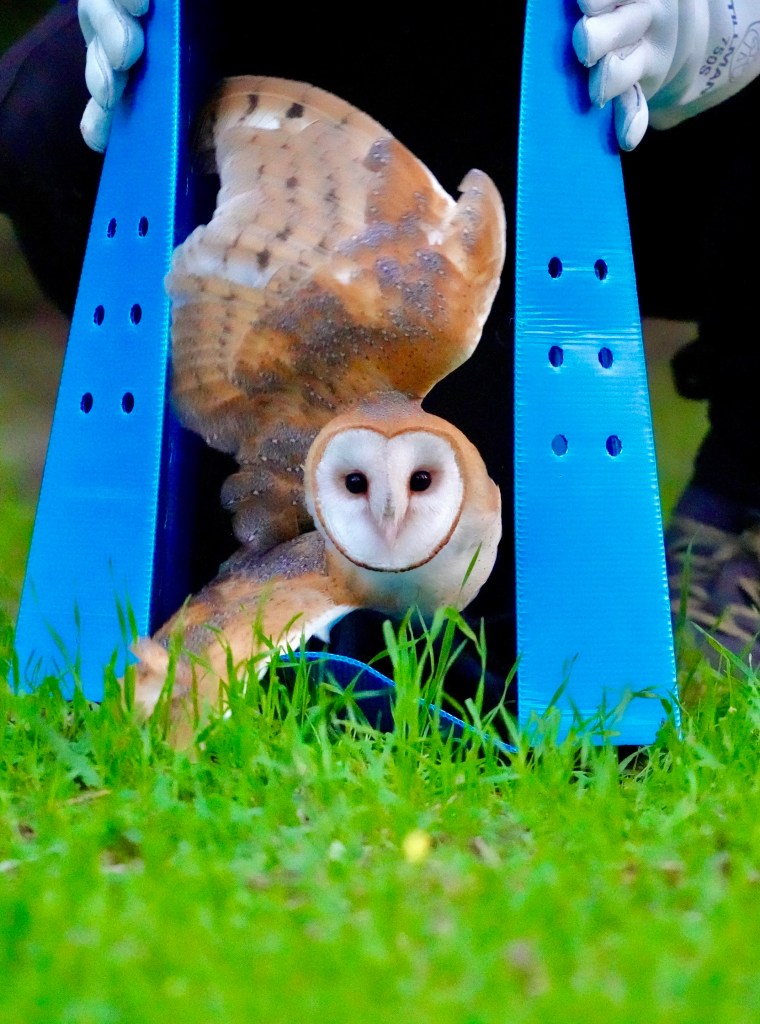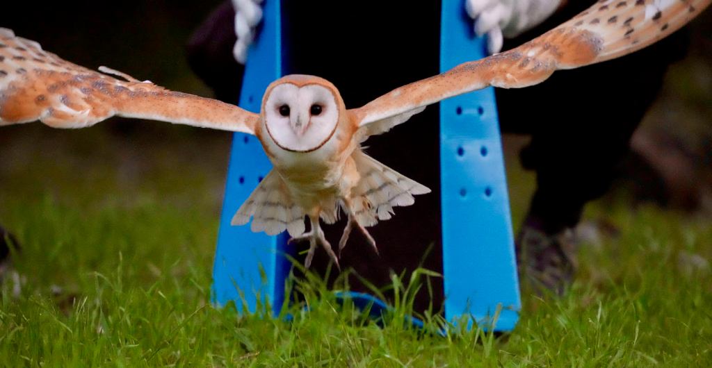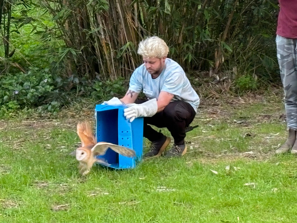 There were quiet gasps of awe as a barn owl took wing on Saturday, emerging from a cardboard travel box and then flying rapidly away from the people grouped near Stow House to witness her return to the wilds of Goleta.