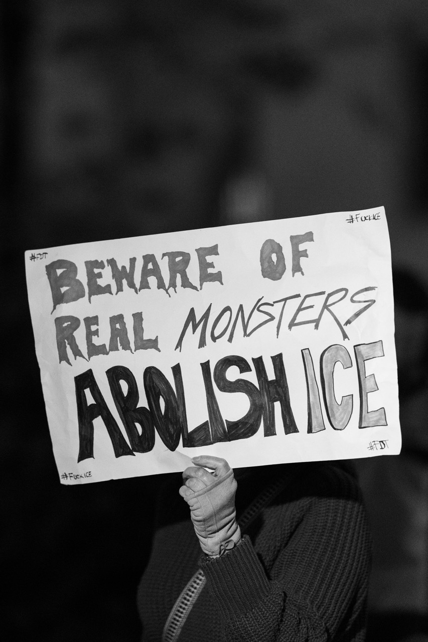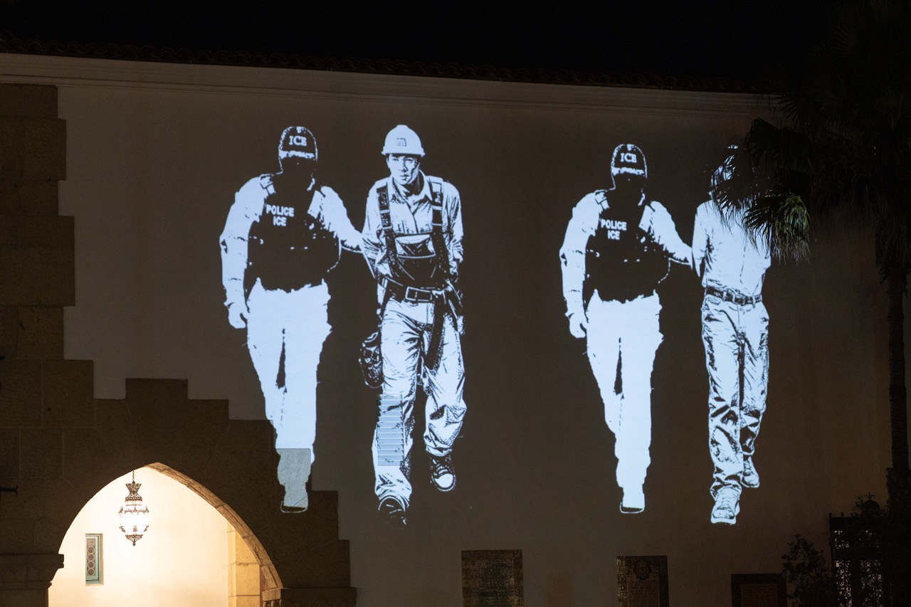 Following the demonstration, a video installation created by artist @VJayBombs was projected from the street onto the courthouse walls. The video, called “Love Thy Neighbor,” showed a series of images, ranging from satirical portraits of President Donald Trump and members of his administration, to a set of photos of a masked ICE officer arresting a wide variety of workers and known historical figures.