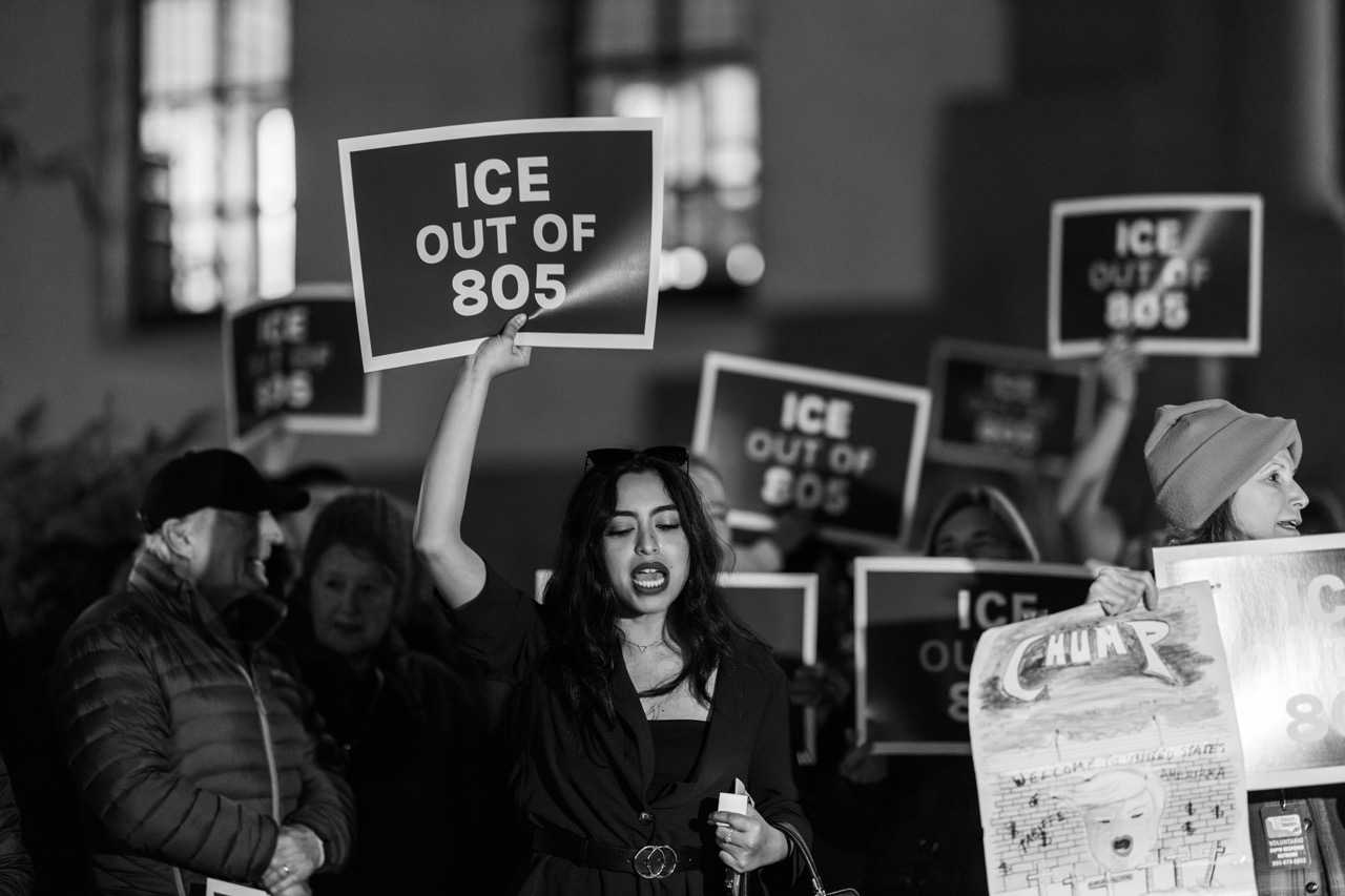 Those that gathered at the courthouse demonstration held signs reading “ICE out of 805” and “Abolish ICE,” and the crowd chanted Good’s name before a couple of speakers addressed the crowd. Community organizer Chelsea Lancaster, who has been monitoring recent ICE activity with SBResiste, asked for more members of the public to join in protecting their neighbors in the streets.