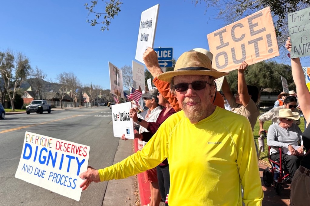 A lively crowd lined the sidewalk in front of the Solvang Veterans Hall on Sunday, February 1, for a peaceful “Stand with Minnesota” rally organized by Indivisible. Demonstrators stretched out on both sides of Highway 246, carrying signs expressing support for immigrants and protesting ICE brutality and the cruelty and corruption of an administration which, in the words of one protester, is looting us, not governing us.