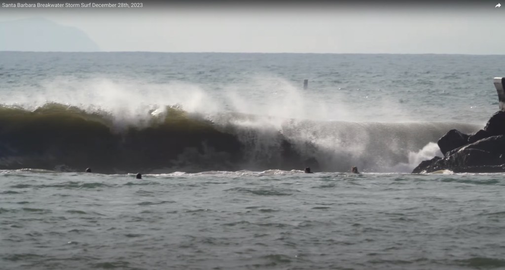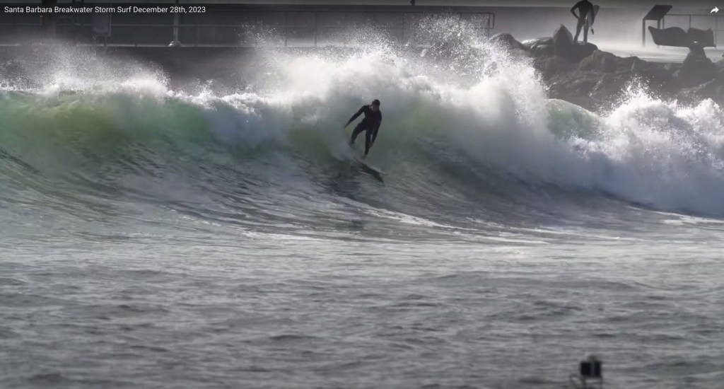 Big waves at Santa Barbara’s harbor mouth are unheard of, except when high tide and cyclone-driven swells coincide, as they did on Thursday morning. Videographer Dave Everett captured surfers from across the water at Stearns Wharf: “There were some pretty impressive impacts against the breakwater, and I caught what appeared to be a younger crowd of surfers challenging this normally calm break. Today was probably the most dramatic backsplashes I have ever seen at the breakwater — somewhere in the vicinity of 30-40 feet high!”