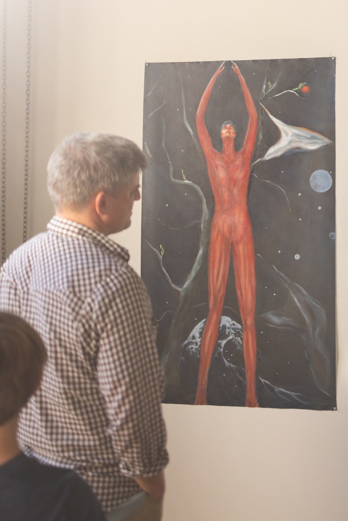 Gallery owner Nathan Vonk looks at the exhibition ‘Creative Resistance/The Artists Perspective on Our Changing World’ at CAW, August 8, 2025 | Photo: Ingrid Bostrom