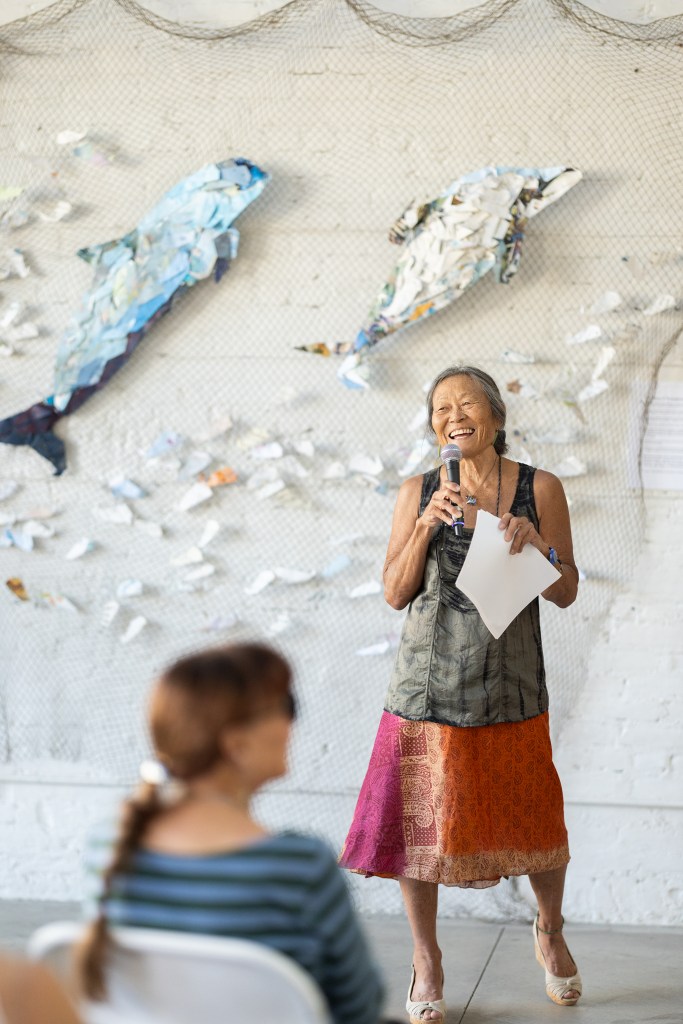 Artist Peggy Oki, with her work in the background, speaks at ‘Creative Resistance/The Artists Perspective on Our Changing World’ at CAW, August 8, 2025 | Photo: Ingrid Bostrom