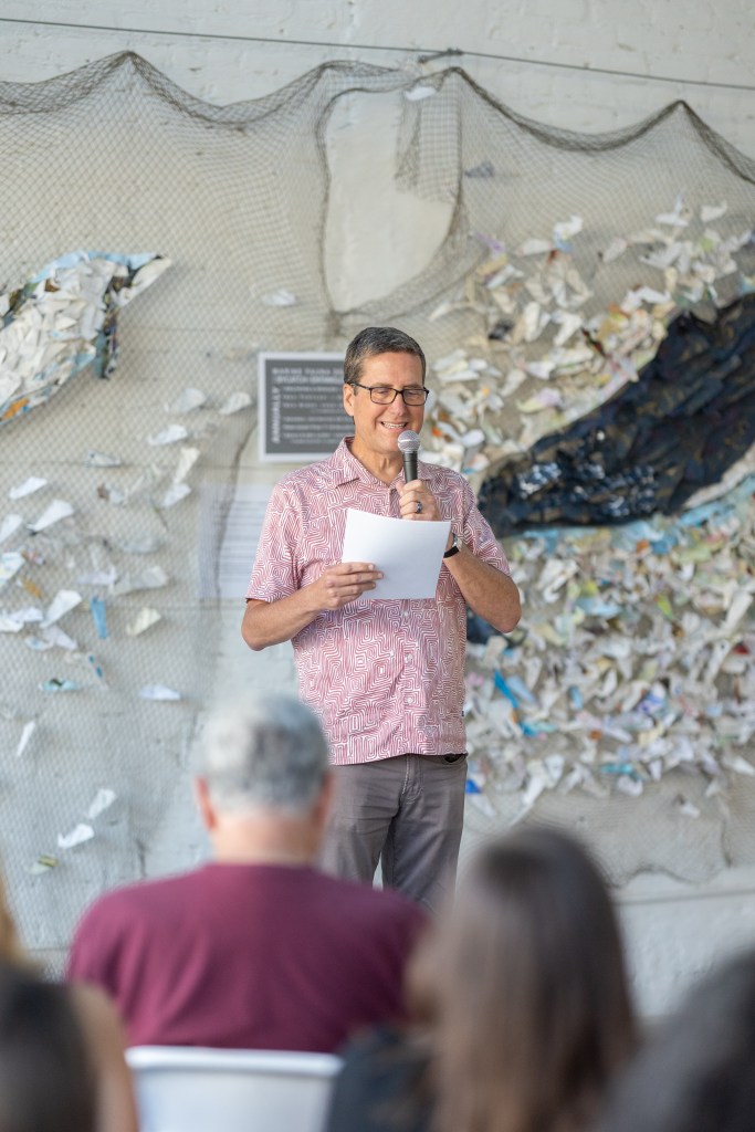 Poet Laureate George Yatchisin speaking at ‘Creative Resistance/The Artists Perspective on Our Changing World’ at CAW, August 8, 2025 | Photo: Ingrid Bostrom