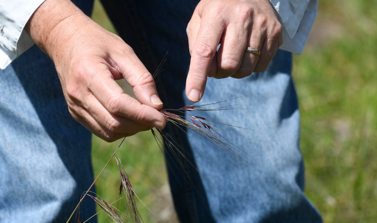 Channel Islands Restoration's Elihu Givertz points to the bent awns that distinguish the native purple needlegrass, a bunch grass that promotes nesting spaces for birds like the grasshopper sparrow.