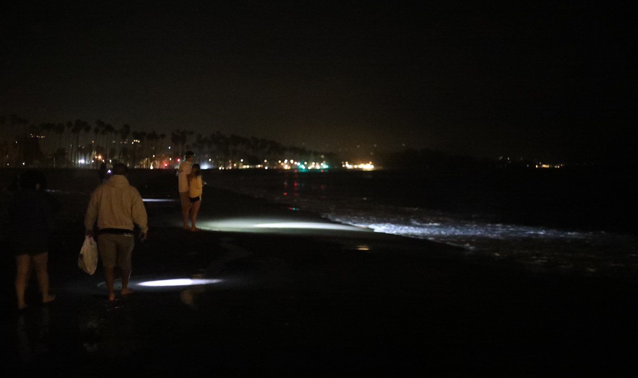 Lights shine on on West Beach as people search for grunions late at night.