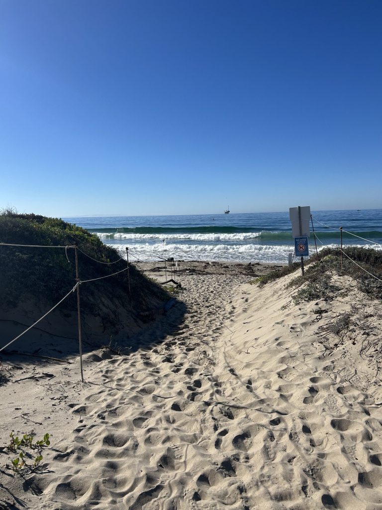 I’m walking with Maya Johnson and Richelle Boyd to Deveraux Beach, just west of I.V. To get to the beach, you walk through UCSB’s North Campus Open Space, a wetland and estuary that the university’s Cheadle Center has worked to revitalize and maintain. There are rare plant species in this area. Birds stand in the water, and sometimes you can hear wildlife at night. The path to the beach is fairly straight and slightly uphill. Both Johnson and Boyd attended UCSB starting in the fall of 2021, as the university’s in-person classes started again in earnest. Now, they both work for the Independent.
