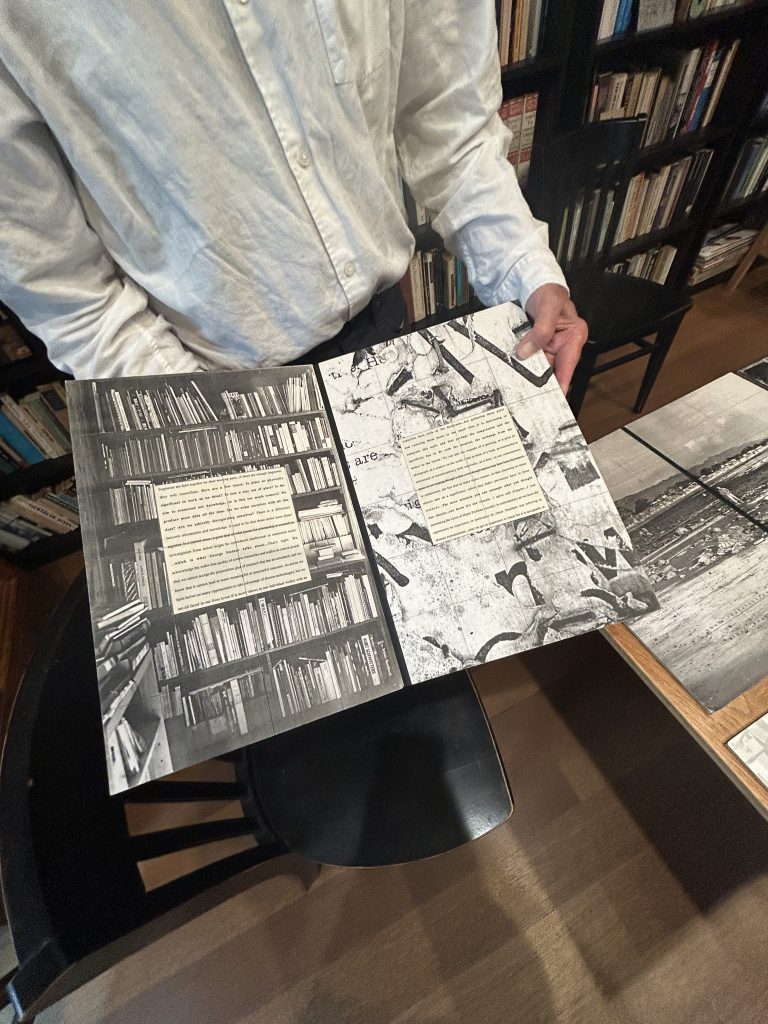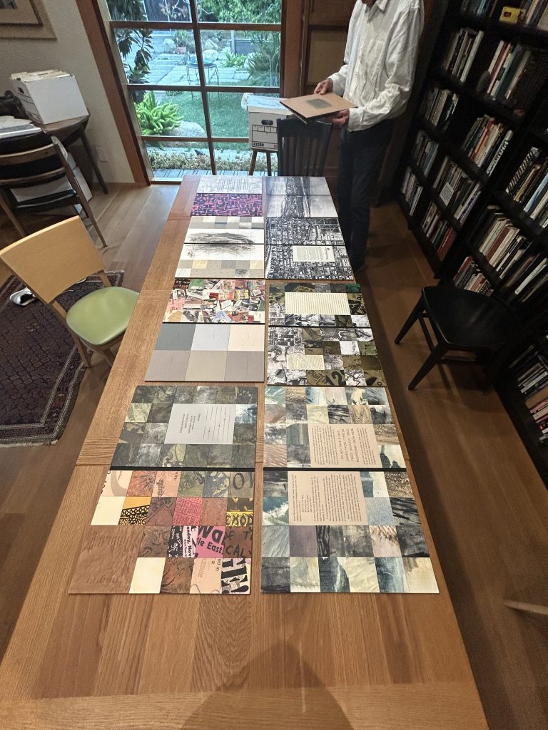 The Contemporary Arts Forum, now the Museum of Contemporary Art Santa Barbara, displayed the installation in open wood cases stuffed with eucalyptus and tar in a compartment underneath the books. That way, you could smell part of I.V. as you examined the work. There were nine books that opened to panels made of image and text — old fliers found on telephone poles and at kiosks that Sandra Reese collected around I.V., photographs, or pieces of conversation. There’s parable and lines pressed into the panels themselves.