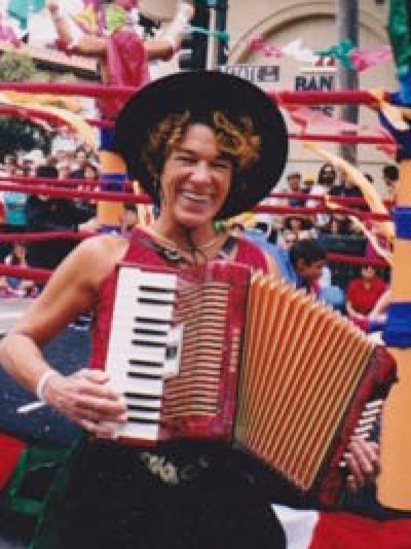 On a whim, her husband Chris Carson, bought an old inoperable accordion. After thoroughly cleaning the instrument, Chris presented it to Nena, and another passion took hold. She soon joined the local Santa Barbara Accordian Club, and over the course of more than 20 years participated in the Solstice Parade with the Club, and many other music festivals. Nena became interested in professional clowning, and with her trusty accordion, developed her persona as “Squeezy the Clown”, and was often seen busking at the local farmers’ market. She said “It’s my privilege to make people laugh.”
