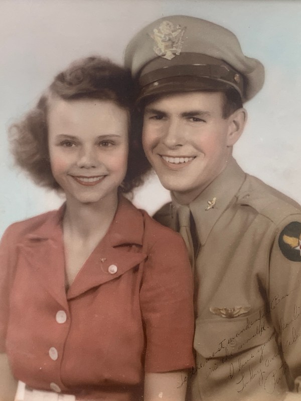 Pat met her future husband Willard (Bill) Mumford in the marching band. She played piccolo, and he played coronet. Emma said she was happy for Pat to be dating “that handsome boy” from band. They planned a wedding in 1943, but Bill had enlisted in the Army Air Corps and was suddenly called up for service, so they had a quick ceremony at Pat’s home before Bill was sent off for pilot’s training. Pat followed Bill around the country as he was moved from one air base to another, finding odd jobs and rooms to rent to be near her new husband. While Bill flew “the hump” in Burma carrying supplies to China under very perilous conditions, Pat did secretarial work in Omaha.